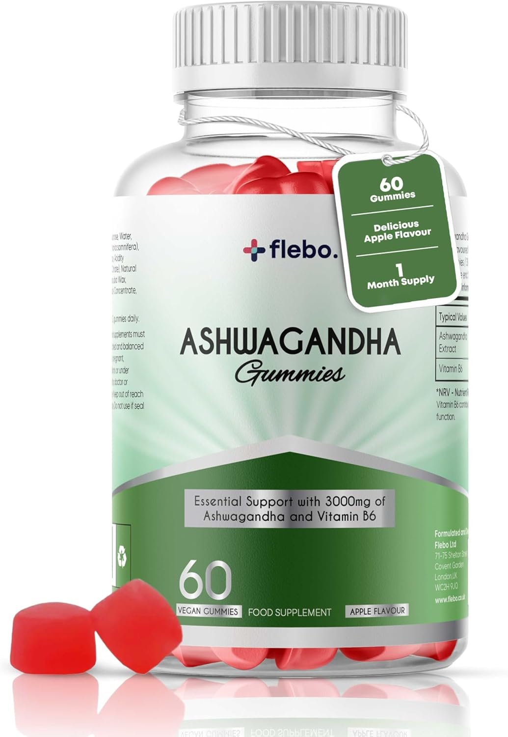 ✔ DELICIOUS APPLE FLAVOURED ASHWAGANDHA GUMMIES: Tired of unpleasant aftertastes and hard-to-swallow Ashwagandha tablets? Flebo Ashwagandha Gummies offer a convenient and tasty alternative. Each bottle contains 60 gummies, providing a 1-month supply. Just take two delicious apple-flavoured gummies daily to enjoy the benefits of high-strength Ashwagandha, without the bitterness or discomfort of traditional Ashwagandha supplements.