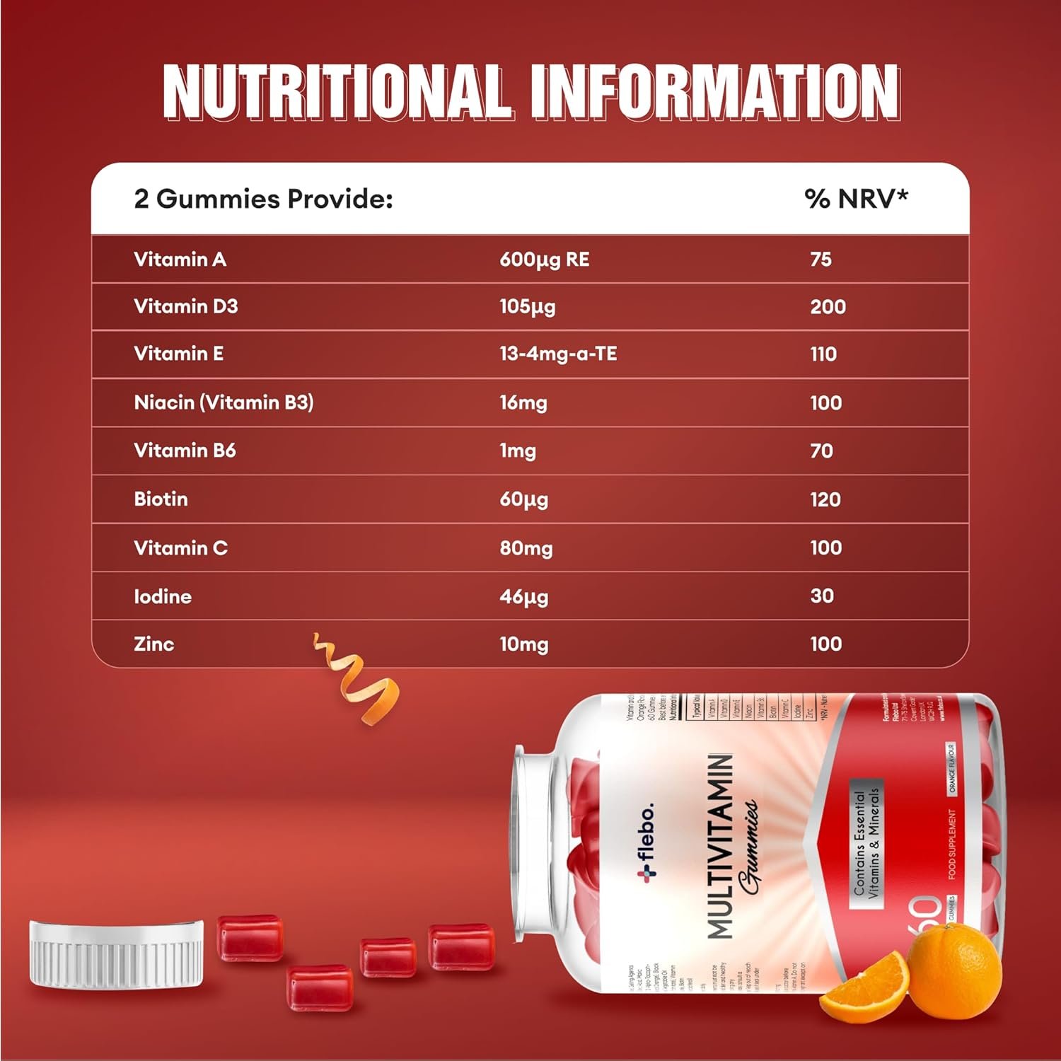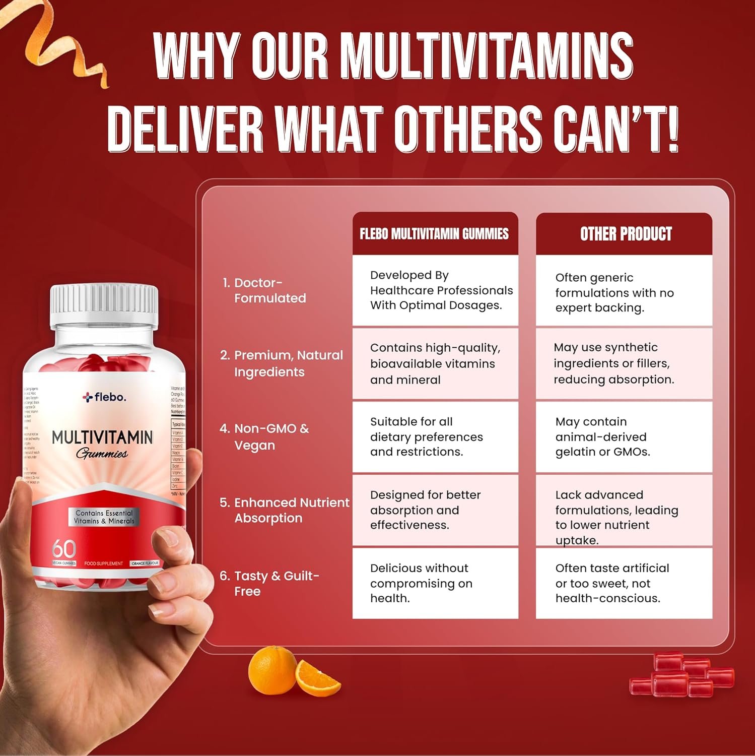 ✔ HIGH STRENGTH MULTIVITAMIN GUMMIES FOR ADULTS: Flebo Adult Multivitamin Gummies are a delicious and convenient way to support your overall health and well-being. Packed with essential vitamins and minerals, these gummies are designed to fill nutritional gaps in your daily diet. Each serving delivers a perfect blend of Vitamin A, C, D, E, B6, and more, supporting immune function, energy levels, and skin health.