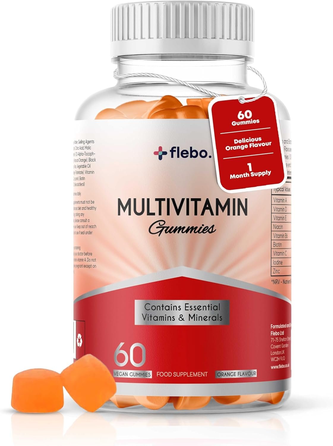 Flebo Multivitamin Gummies for Women & Men – Vegan Chewable Adult Orange Flavour 60 Gummies – 1 Month Supply, 9 Vitamins & Minerals VIT C, D3, B6, B7, Iron & Zinc – Immune Support & Skin Health