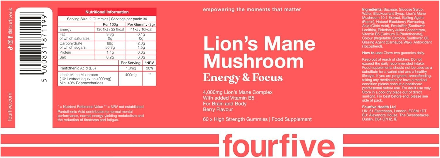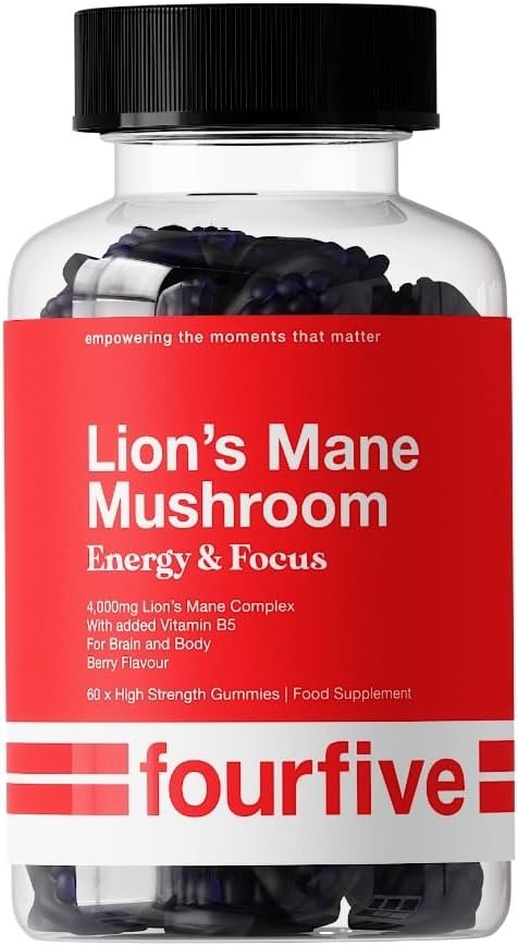 fourfive Lions Mane Mushroom Gummies (4000mg) Energy & Focus Blend with Vitamin B5, Support Brain Function, Focus & Energy – 60 Gummies