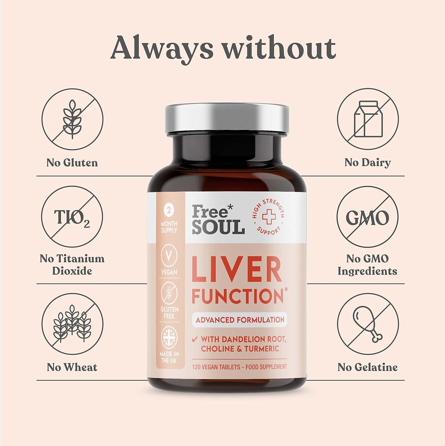 Free Soul’s Liver Support contains a high-concentation of Choline & Artichoke.This powerful duo ingredients forms the base of liver support, which is further enhanced by Free Soul’s unique blend of superfoods also included in each serving. Free Soul’s Liver Function Supplement contains a range of superfoods, vitamins, and minerals to support. Our advanced liver support supplement contains an unmatched combination of Choline, Artichoke Leaf, Inositol, Acai Berry, Turmeric, Amla Berry, L-Glutamine, Bupleurum Root, Schisandra Berry, Ginger Root, Black Aged Garlic, and Vitamin C to support, cleanse, and detox. Our Liver Support Supplements are proudly made in the UK using only the finest ingredients to ensure maximum absoption. Liver Support is free-from gluten & dairy and is free-from GMO-ingredients. The tablets are 100% shelf life stable and no refrigeration is required. We source all of our liver cleanse & detox ingredients sustainably from the most reputable sources available. The packaging of Free Soul’s Liver Function Supplement is recyclable. Free Soul is a trusted health & nutrition brand that serves thousands customers across the globe. Our high quality products undergo a strict quality certification & third party testing process in the UK, while adhering to global production standards.