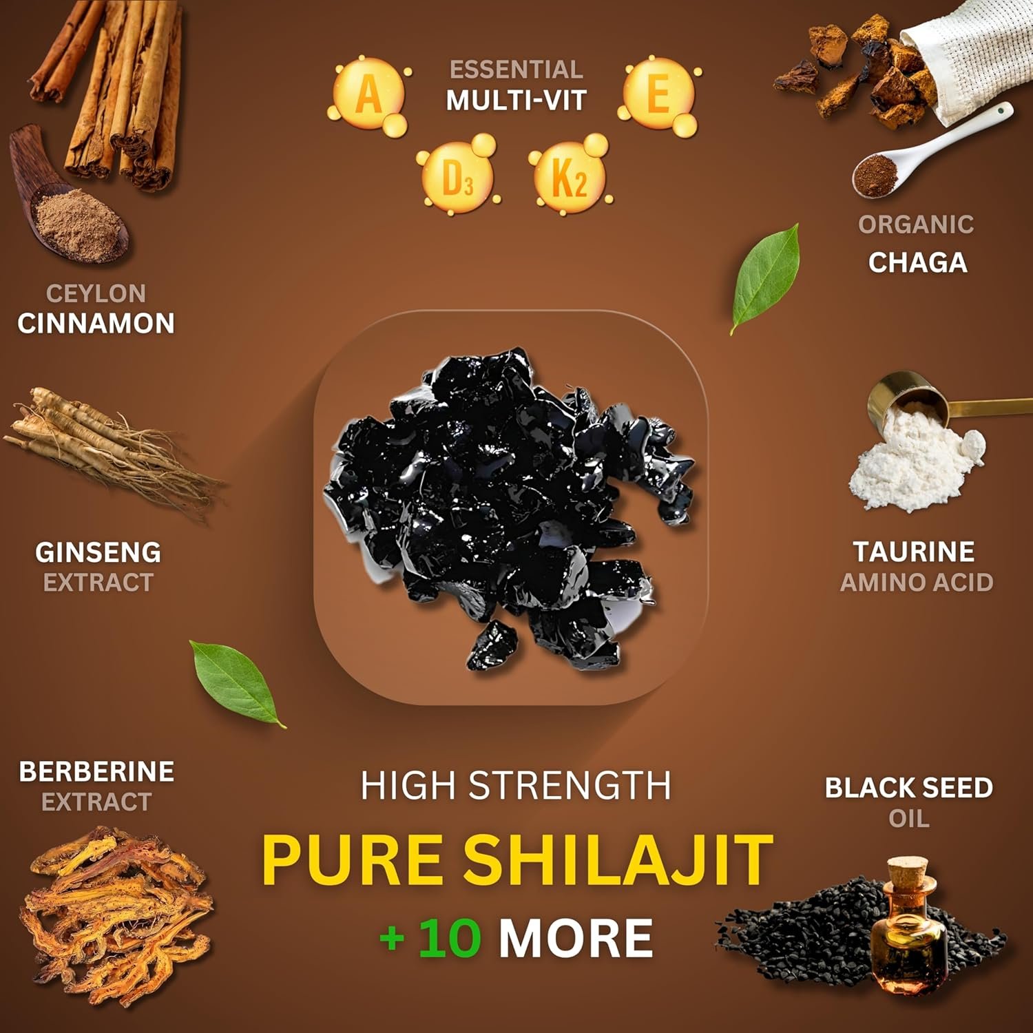 ✨High Potency Shilajit Capsules: Our Pure Himalayan Shilajit Capsules deliver an impressive 20000mg of all content with 500 mg shilajit, enriched with 70% fulvic and humic acid & 85+ essential minerals. These high-strength capsules are designed to boost energy and stamina naturally.