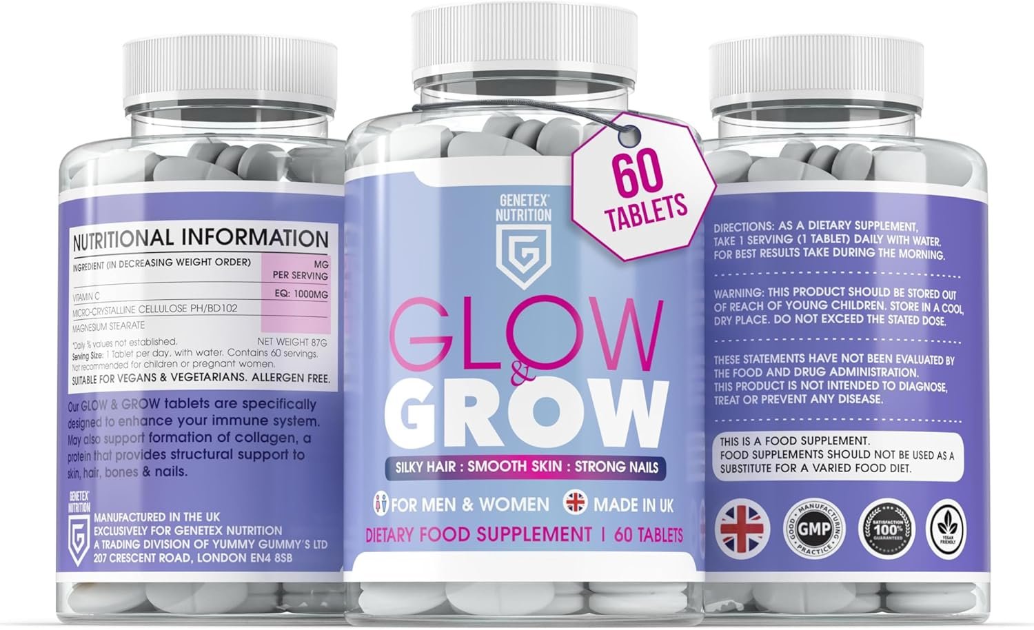 Glow & Grow Vitamin C Supplement for Men & Women Hair, Skin & Nails | Vegan & Allergen-Free | Natural Skin & Hair Support | Made in UK | Daily Beauty Nutrition | 60 Capsules
