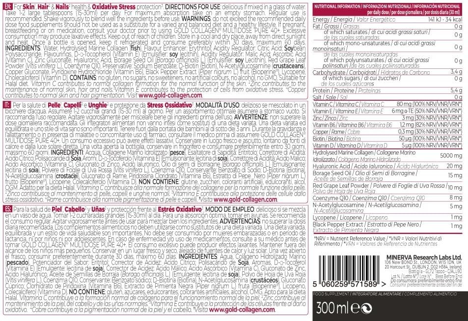 GOLD COLLAGEN Multidose 40+ – Collagen Supplements for Women & Men with Vitamin C & D, Hyaluronic Acid, Marine Collagen for Hair, Skin, Nails & Bones Health – Antioxidant, Immune System Booster, 300ml