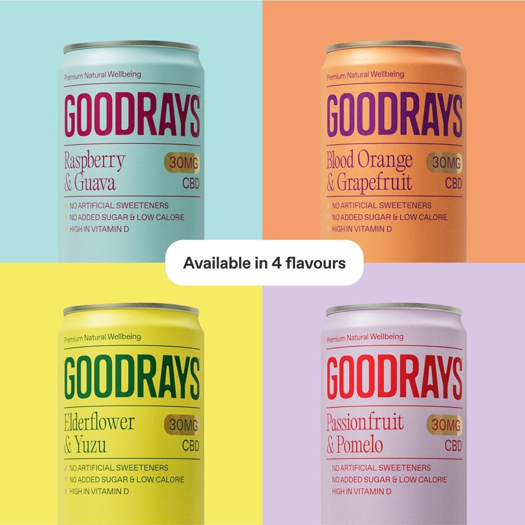 Be the first to review “GOODRAYS CBD Drinks, Sparkling Low Calorie Soft Drink, Natural Sleep Stress and Anxiety Relief, Vegan, 4 Flavour Mixed Pack, 12 x 250ml Cans, Packaging May Vary”