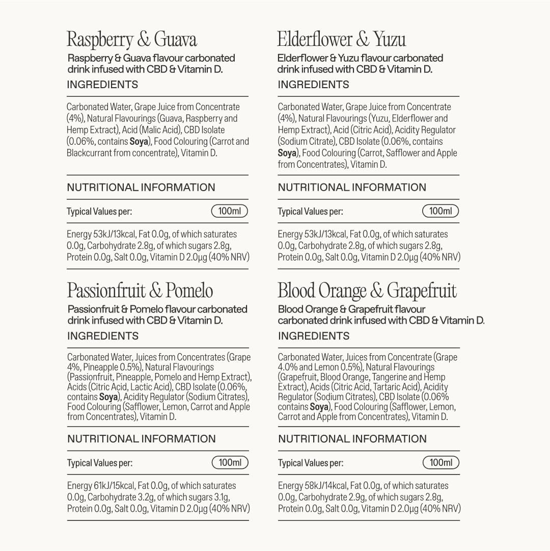 Delicious, refreshing, all-natural drinks infused with 30mg of premium sun-grown CBD and high in Vitamin D, sustainably sourced and independently tested for quality and safety. This 4 flavour mixed pack includes all four of our expertly crafted blends: the dry citrus flavours and sweet floral notes of Elderflower & Yuzu; the zesty, aromatic citrus flavours and sharp finish of Blood Orange & Grapefruit; the sweet berry flavour and floral finish of Raspberry & Guava; and the punchy tropical flavours with a sweet citrus finish of Passionfruit & Pomelo. Enjoy as a healthy lunchtime refreshment, a mid-afternoon reset or a relaxing sundowner. Because a good life needs a clear head. No added sugar. No artificial sweeteners. Only 33 calories. 100% vegan.