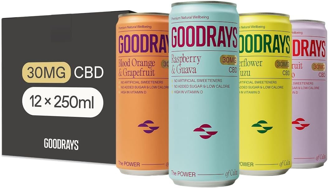 GOODRAYS CBD Drinks, Sparkling Low Calorie Soft Drink, Natural Sleep Stress and Anxiety Relief, Vegan, 4 Flavour Mixed Pack, 12 x 250ml Cans, Packaging May Vary