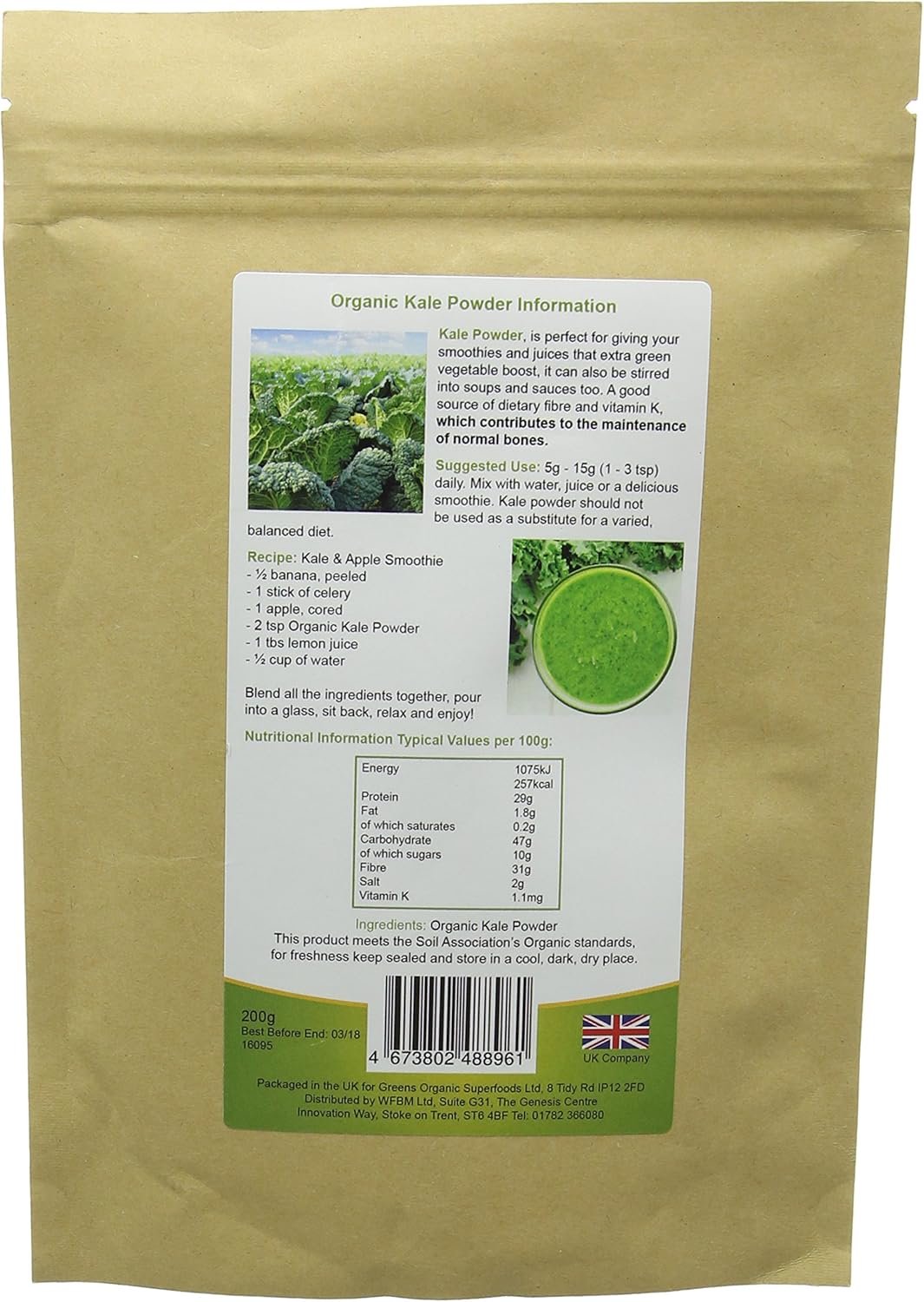 Greens organic kale powder is perfect for giving your smoothies and juices that extra green vegetable boost. It can be stirred into soups and sauces too. It is a good source of dietary fibre and vitamin K which contributes to the maintenance of normal and normal blood clotting. It can help digestion and prevent constipation. Rich in protein, which contributes to a growth in and maintenance of muscle mass.