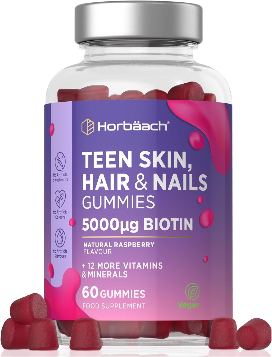 Hair Skin Nail Gummies for Teens | 60 Count | Raspberry Flavour | 5000ug of Biotin for Hair Growth | with Folic Acid, Inositol, Choline & More | Suitable for Vegans | by Horbaach
