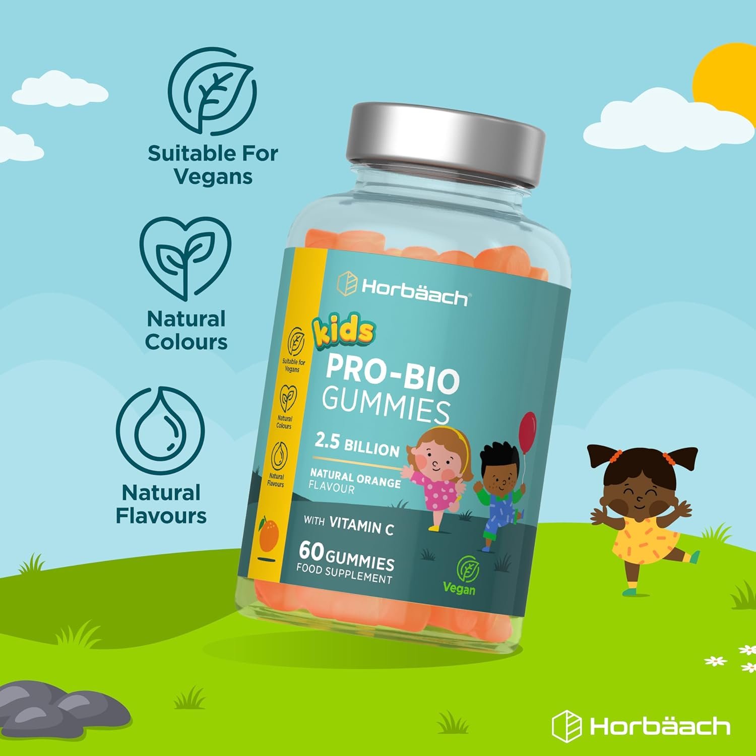 Happy Gut Gummies Kids 2.5 Billion CFU | 60 Count | ProBio Gut Health Supplement | Natural Orange Flavour | Kids Complex with Vitamin C | Vegan | by Horbaach