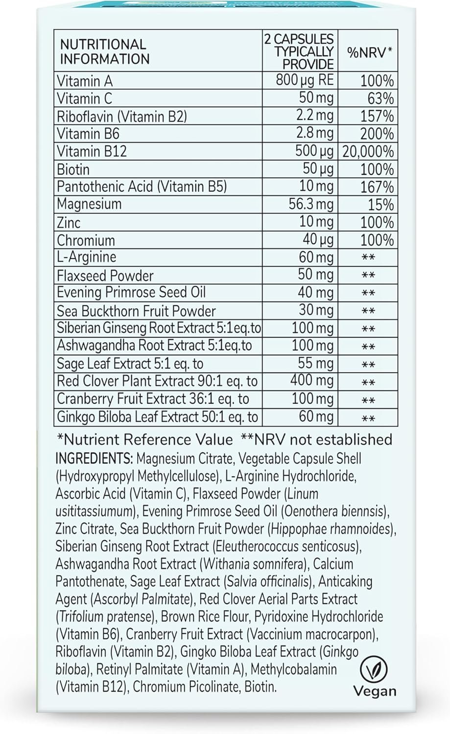 CONTAINS A CAREFULLY FORMULATED blend of nutrients for daily support: VITAMINS A, B2, B5, B6, B12, C and Biotin. MINERALS Magnesium, Zinc and Chromium. BOTANICALS Red Clover, Ashwagandha, Sea Buckthorn, Evening Primrose Oil, Sage, Ginseng, Cranberry, Flaxseed and Ginkgo Biloba