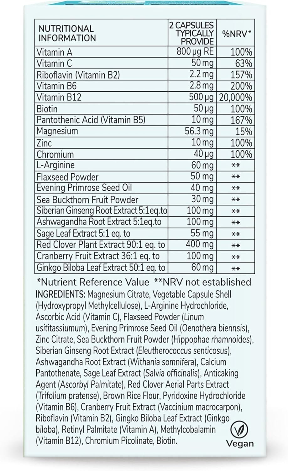 CONTAINS A CAREFULLY FORMULATED blend of nutrients for daily support: VITAMINS A, B2, B5, B6, B12, C and Biotin. MINERALS Magnesium, Zinc and Chromium. BOTANICALS Red Clover, Ashwagandha, Sea Buckthorn, Evening Primrose Oil, Sage, Ginseng, Cranberry, Flaxseed and Ginkgo Biloba