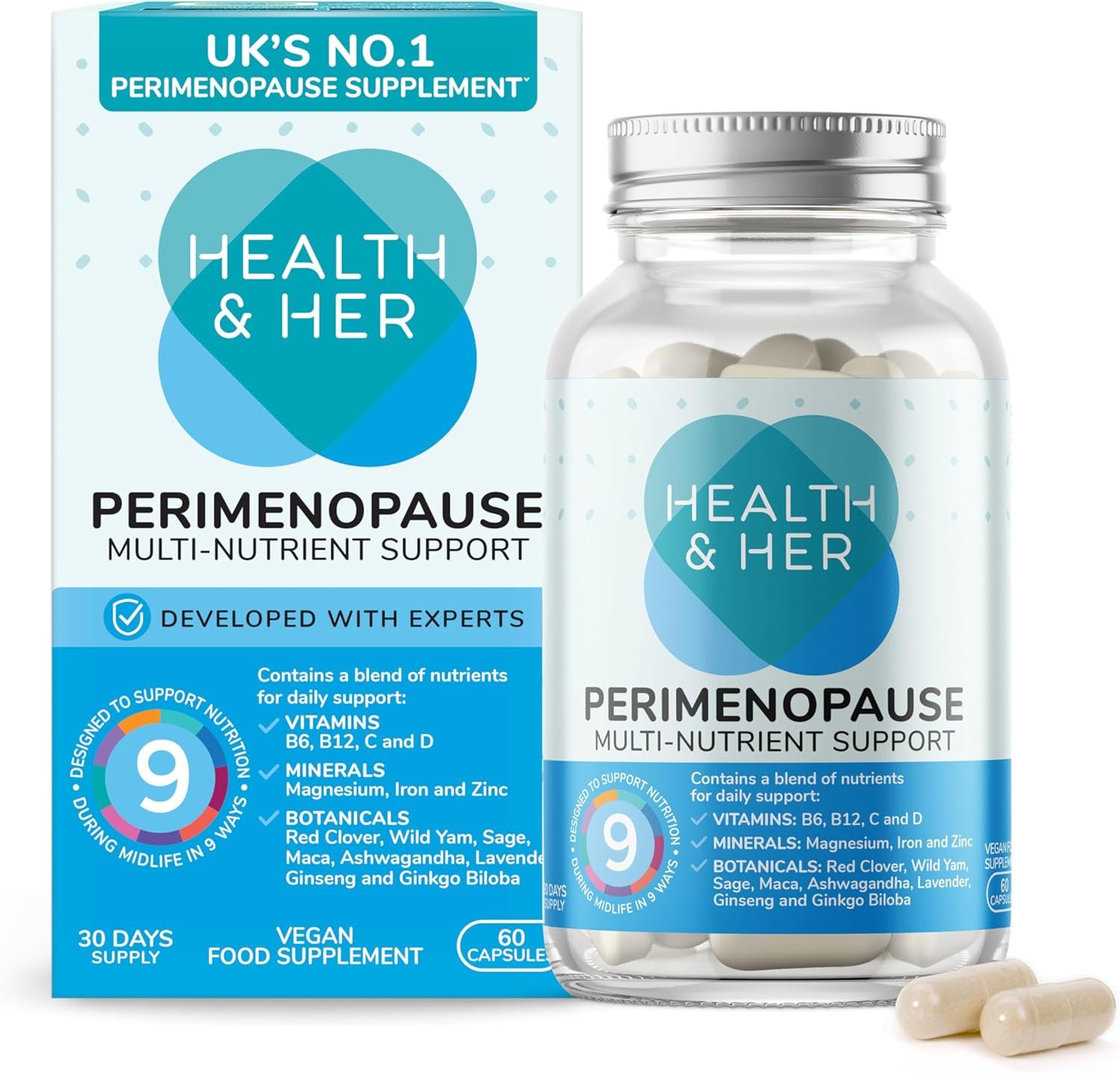 Health & Her Perimenopause Supplements for Women – with Red Clover, Wild Yam Ashwagandha. Wellbeing Support for The Early Stage of Menopause – 1 Month Supply, 60 Capsules – Vegan & Gluten Free