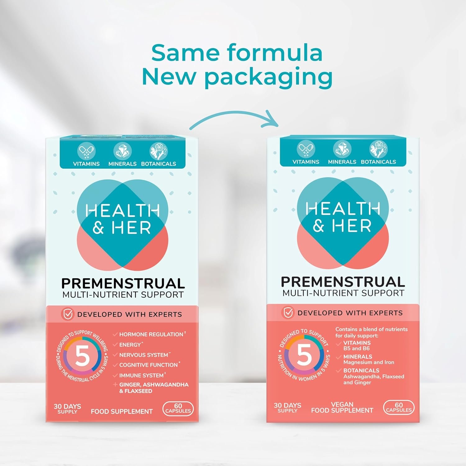 Health & Her Premenstrual Supplements for Women – with Ashwagandha, Flaxseed and Ginger Root – 1 Month Supply, 60 Capsules – Vegan & Gluten Free