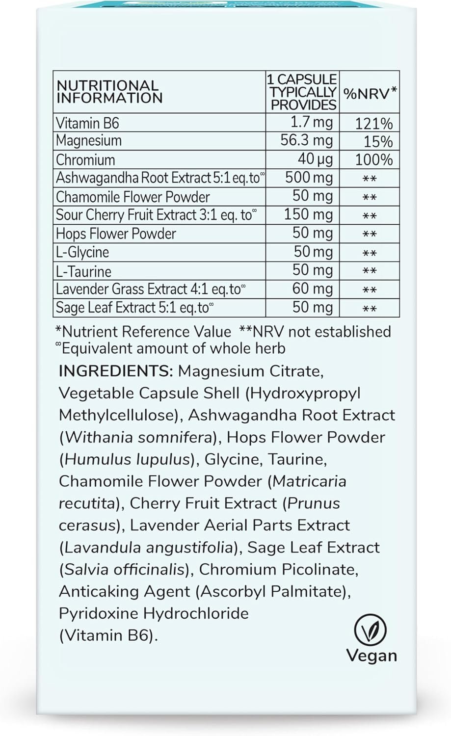 CONTAINS A CAREFULLY FORMULATED blend of nutrients for daily support. VITAMIN B6. MINERALS Magnesium and Chromium. AMINO ACIDS L-Glycine and L-Taurine. BOTANICALS Ashwagandha, Chamomile, Sour Cherries, Hops, Lavender and Sage