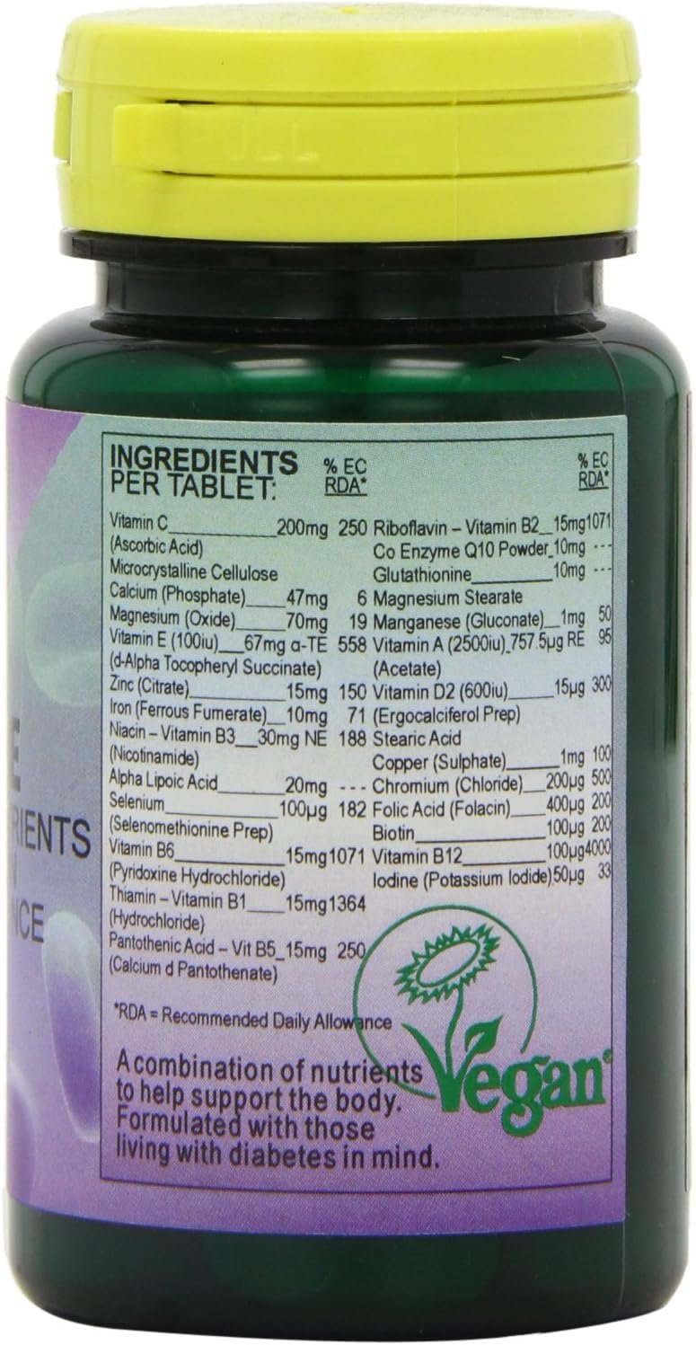 30 VTabs of this diabetic combination of nutrients, including Multi-vitamins, vitamin D, Alpha Lipoic Acid, Co Enzyme Q10, Minerals and Glutathionine. All known to help maintain balanced blood sugar levels and suitable for diabetics.