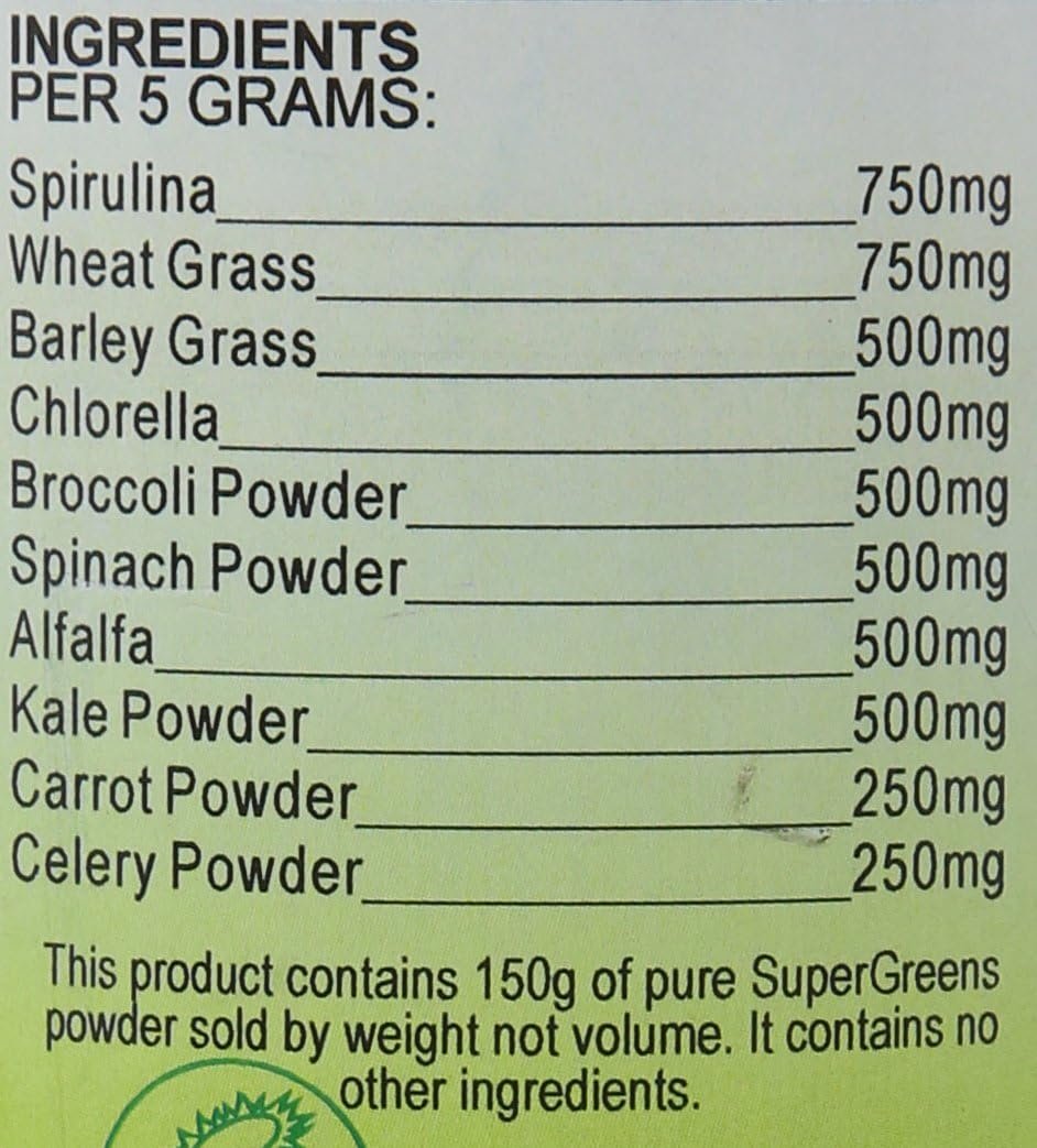 V-150g of this natural ‘superfoods’ formula, brimming with antioxidants, vitamins, minerals, amino acids and other macro nutrients. This combination of wheat grass, barley grass, chlorella, broccoli, spinach, alfalfa, kale, carrot and celery, provides a potent source of raw fuel, to promote great health and well-being as well as increasing your daily green intake to boost energy levels and detox the digestive system. Stir into water or juice for a delicious breakfast drink or add to your morning smoothie. Free from sugar, yeast and lactose, with no colourings. One serving provides 3 of your 5 a day!