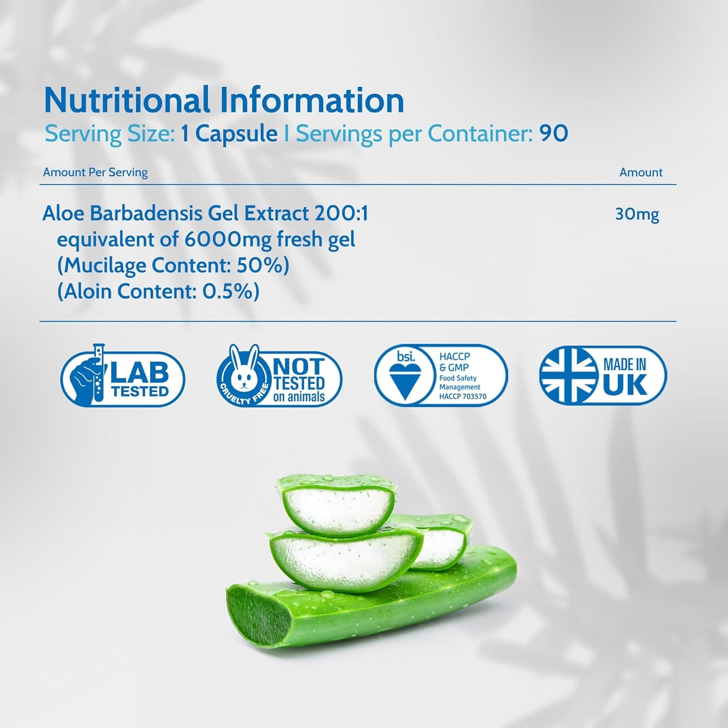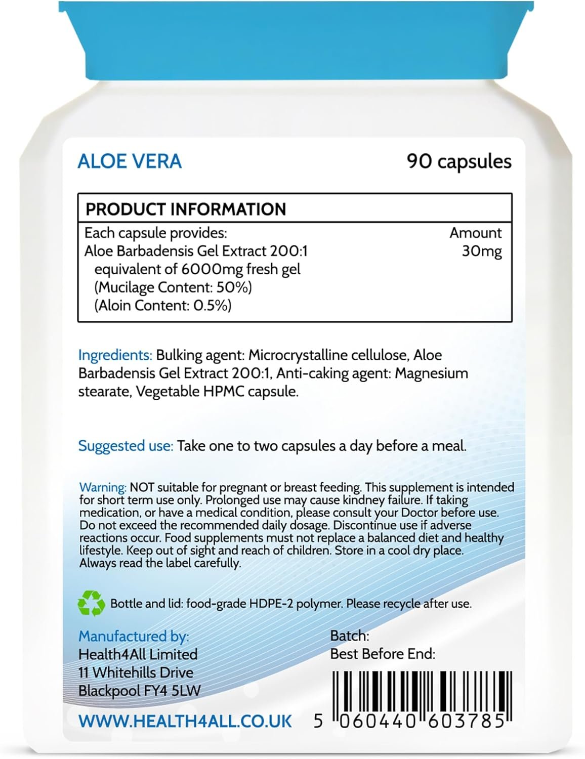Health4All Aloe Vera Gel Extract 6000mg 90 Capsules, Digestive Health Detox Supplement, Support for Leaky Gut, Acid-Alkaline and pH Balance, Pure Vegan Cleanse Capsules (not Tablets) | Made in UK