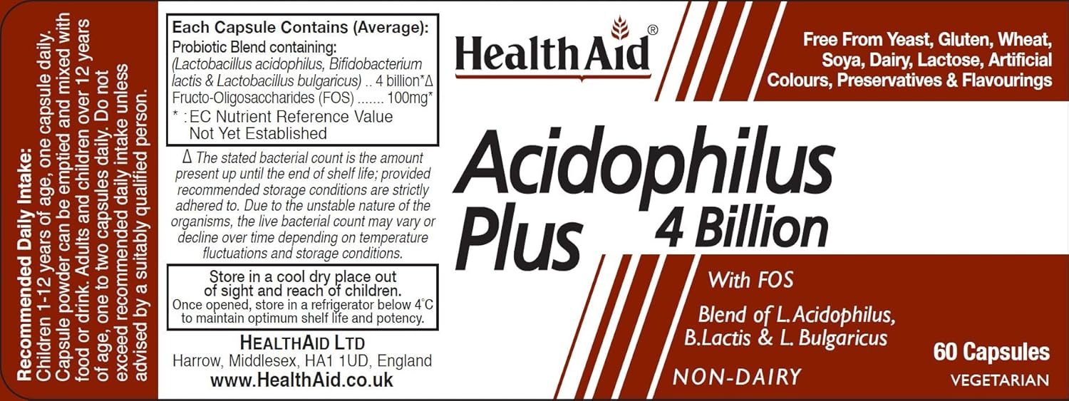 HealthAid Acidophilus Plus 4 Billion capsules are formulated using special strains of Probiotic cultures on a dairy free medium. Fructo-Oligosaccharides (FOS) are added to help support the growth and proliferation of bacterial strains in the intestinal tract. HealthAid Acidophilus Plus 4 Billion helps support a balanced intestinal flora, to maintain good digestion and support healthy immune function.