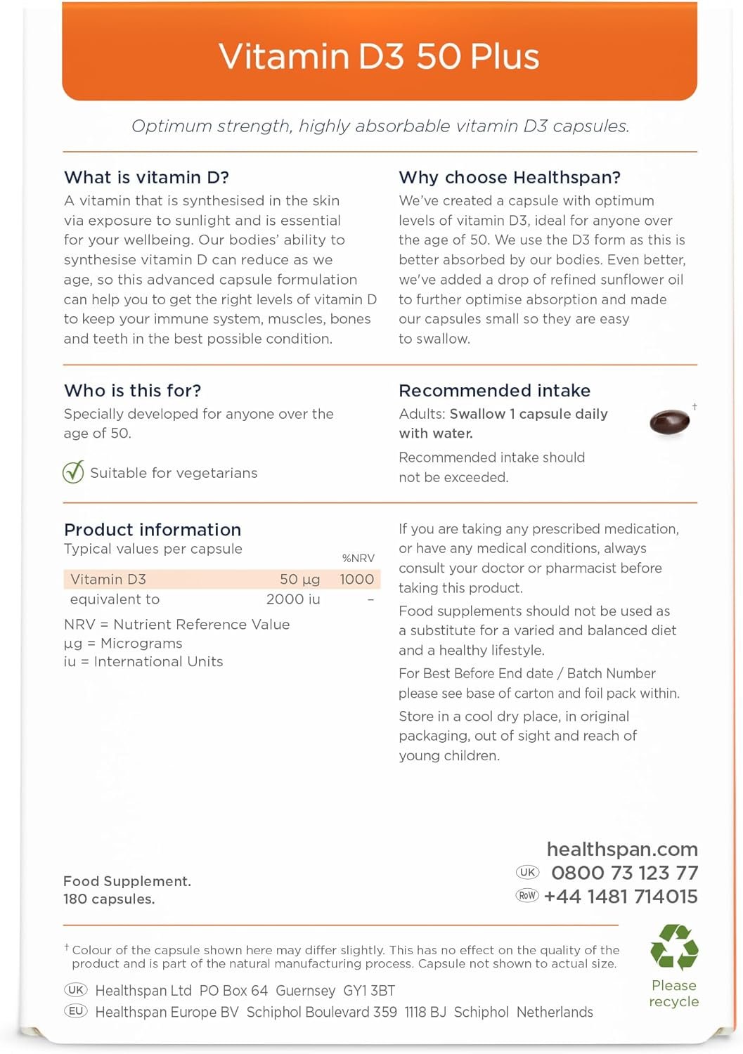 WHY CHOOSE HEALTHSPAN’S VITAMIN D3 50 PLUS? Healthspan have created a small capsule with optimum levels of vitamin D (50ug), specially formulated for those over the age of 50. They’ve also added a drop of cold-pressed extra virgin olive oil, which makes it easier for the body to absorb. Unlike some vitamin D supplements, Healthspan exclusively use vitamin D3, which is the form of vitamin D produced naturally in the body in response to sunlight and is the form our bodies are most able to process.