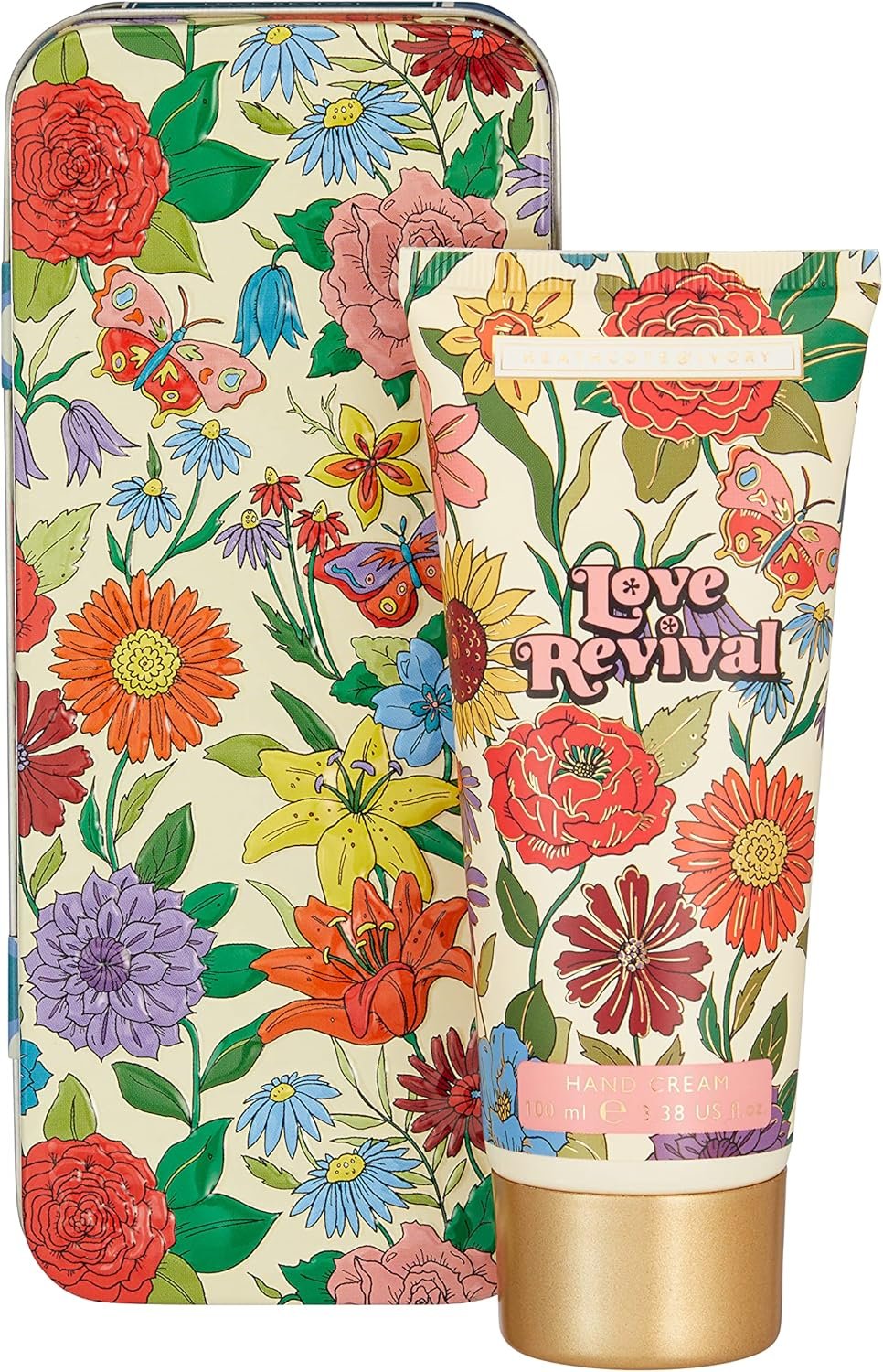 Embrace Mother Earth and feeling free with our eye-catching reusable tin with vegan hand cream inside, decorated with a joyous, eclectic mix of groovy geometrics and ‘’flower power’’ prints. Enriched with shea butter, glycerin and antioxidant vitamin E the velvety hand cream leave skin feeling soft. Calming eucalyptus, lavender and patchouli essential oils, notes of fresh green leaves, lily of the valley and warm sandalwood leaves hands beautifully scented and imparts a feeling of peace. A perfect gift for young at heart modern-day hippies and nature lovers. Cruelty free and vegan friendly. Hand cream tube and cap made from recycled (51% PCR) and recyclable plastic.