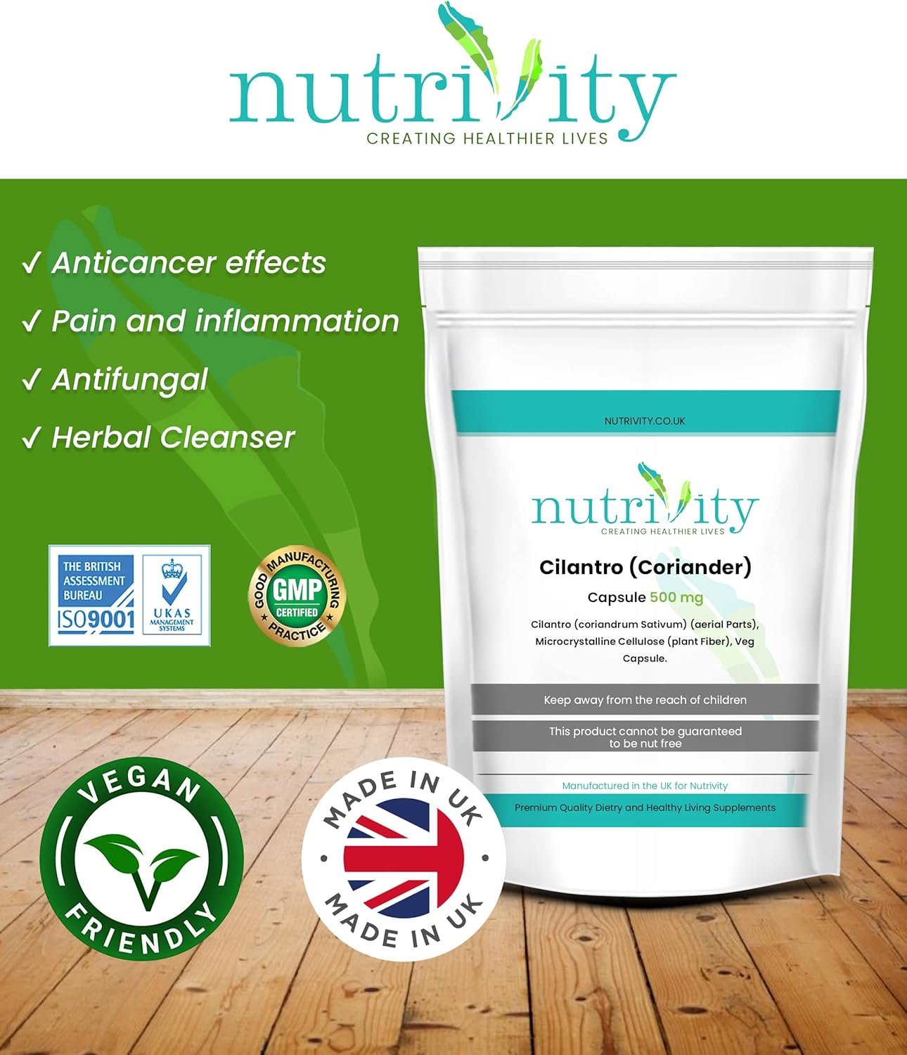 Cilantro Coriander has, for a long time now, been known as the most divisive of herbs. Some love it, others loathe it. The two warring factions seemingly irreconcilable, each in awe of their counterpart’s love/hate for the brightly aromatic herb. The problem? Coriander is incredibly good for you. It is packed full of Vitamin K and a range of potent antioxidants to give your skin a nice glow and help you maintain a healthy immune system.Suitable for both men and women who wish to live a happy and healthier life.Suitable for Vegetarian, vegan and halal diet.Manufactured in the UK to highest standards of GMP.
