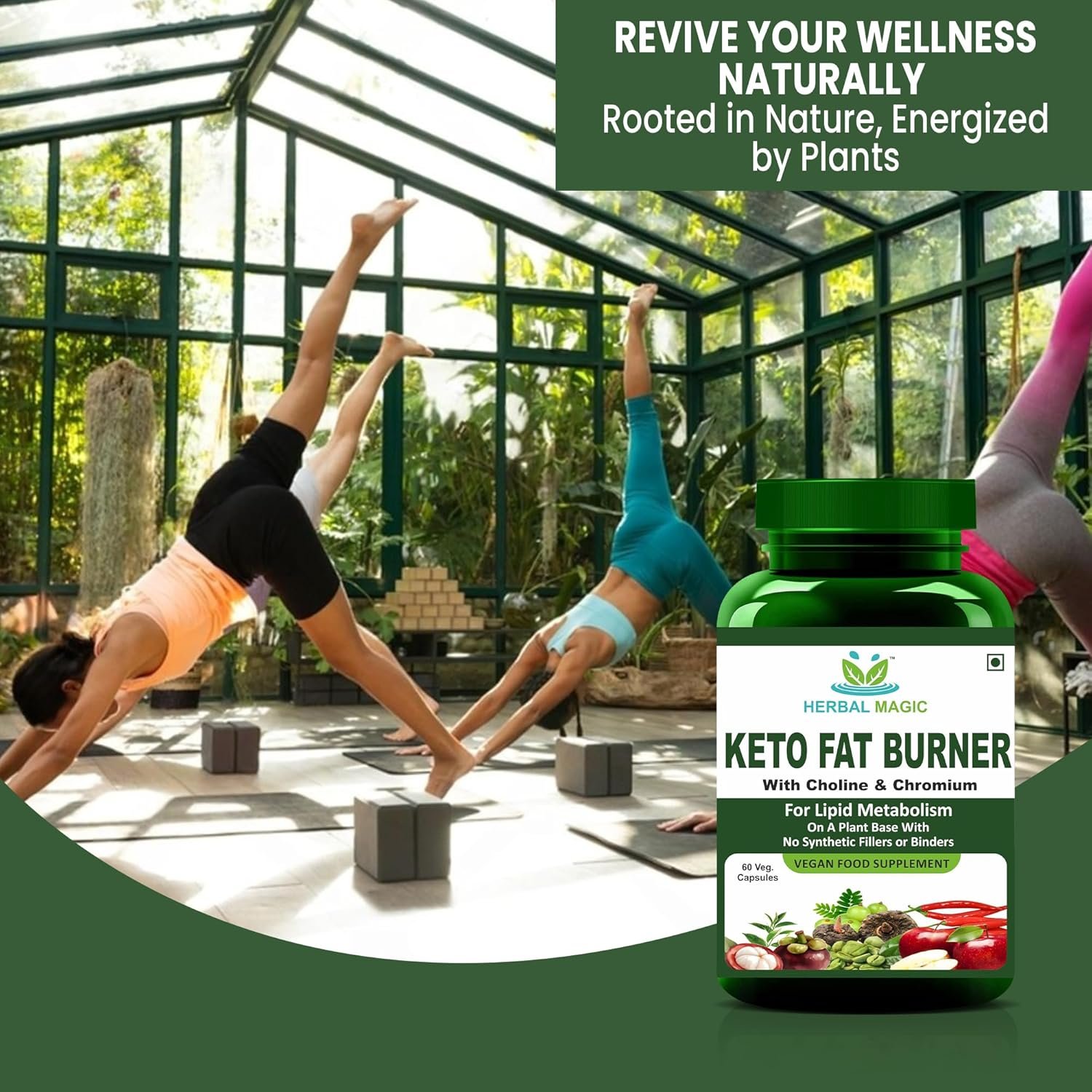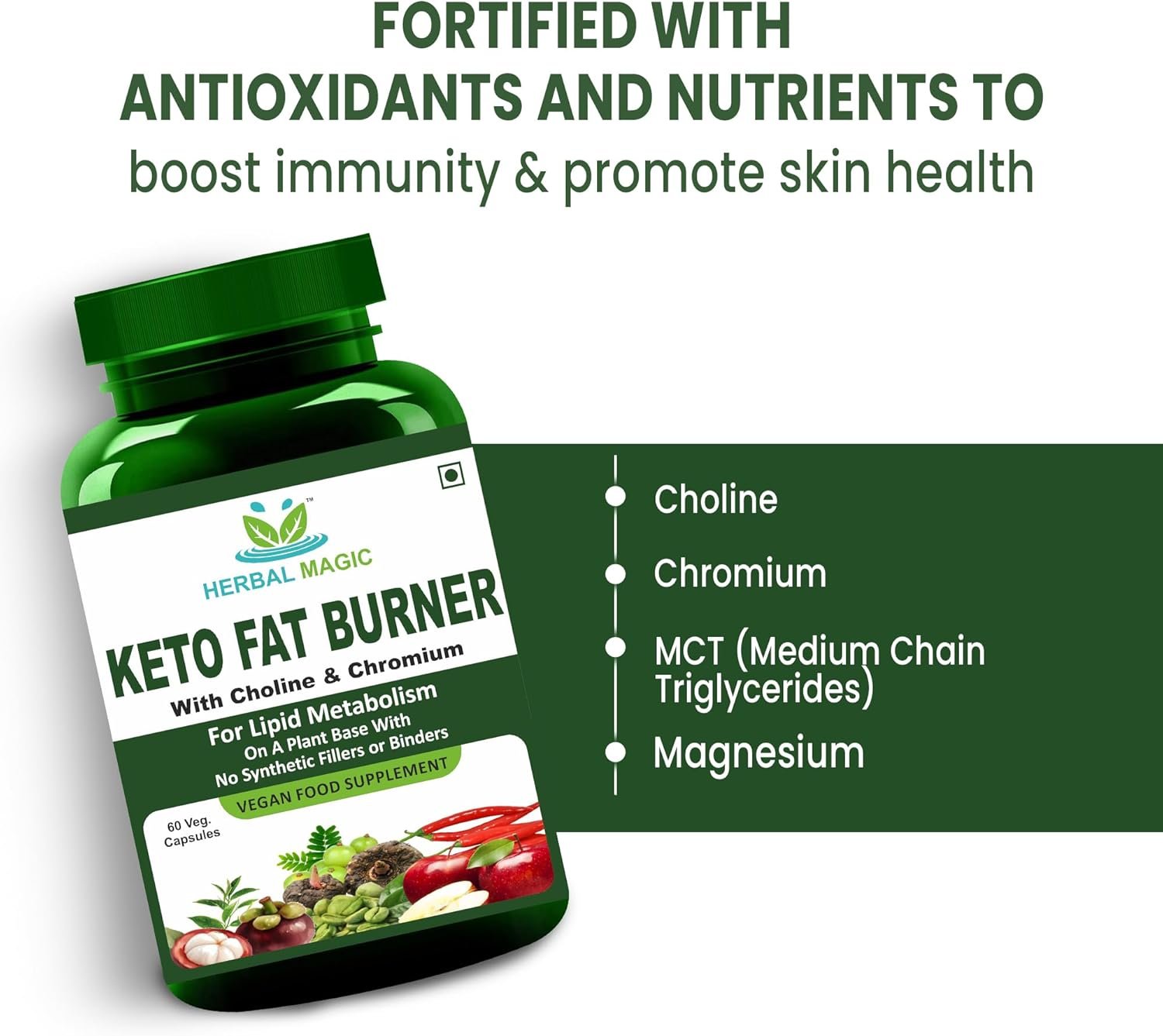 Herbal Magic Keto Fat Burner is a vegan-friendly food supplement formulated to support lipid metabolism and fat burning. Made with Choline, Chromium and MCT on a plant base of Green Tea. This supplement aligns with a Keto-friendly lifestyle. Free from synthetic fillers or binders, it offers a natural option for those looking to enhance their wellness journey. Each capsule contains a carefully selected mix of ingredients with Choline which supports fat metabolism. These fat-burning capsules for men & women complement any wellness or fitness regimen.