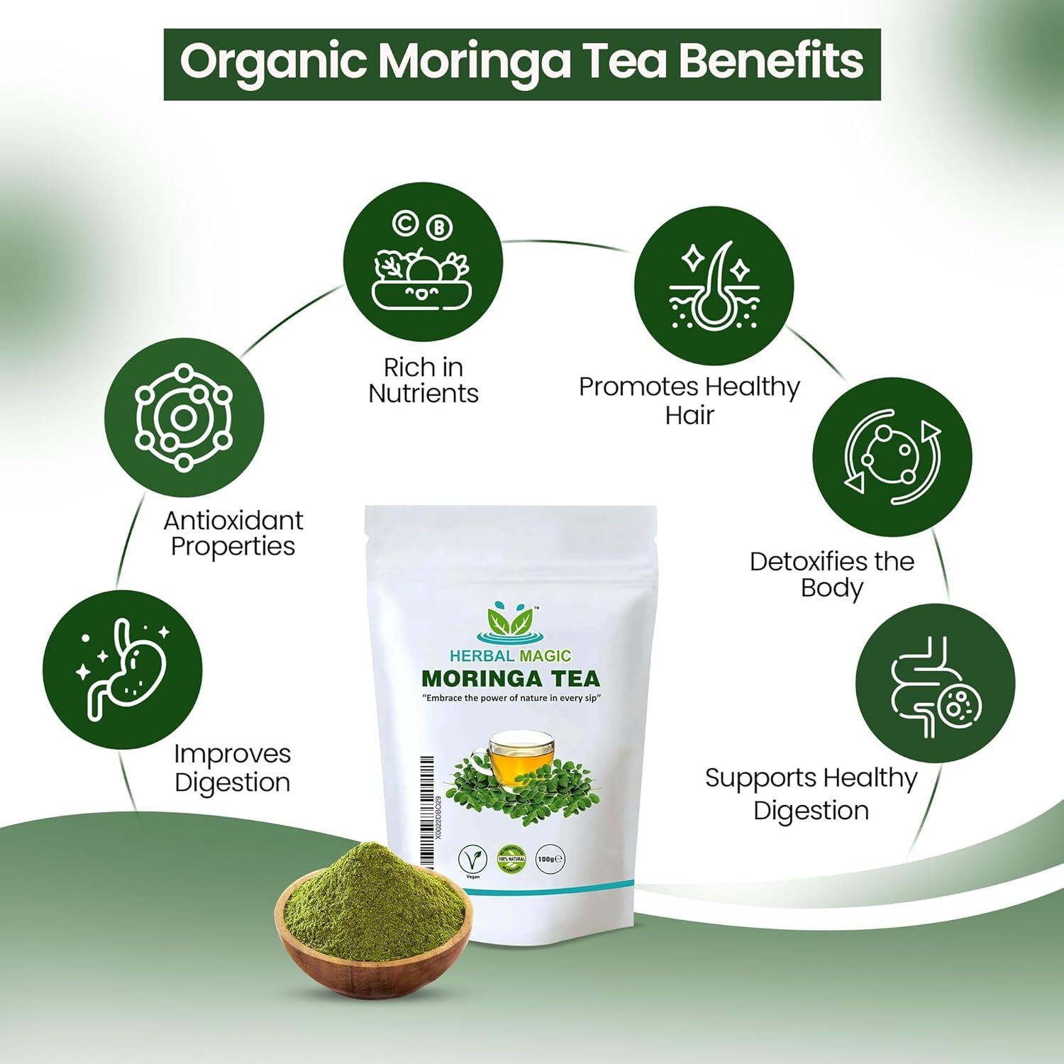 Herbal Magic Pure & Natural Moringa Leaf Tea, A Natural Elixir for Wellness and Vitality, Rich in Vitamins, Minerals & antioxidants Free from Artificial Additives_100g