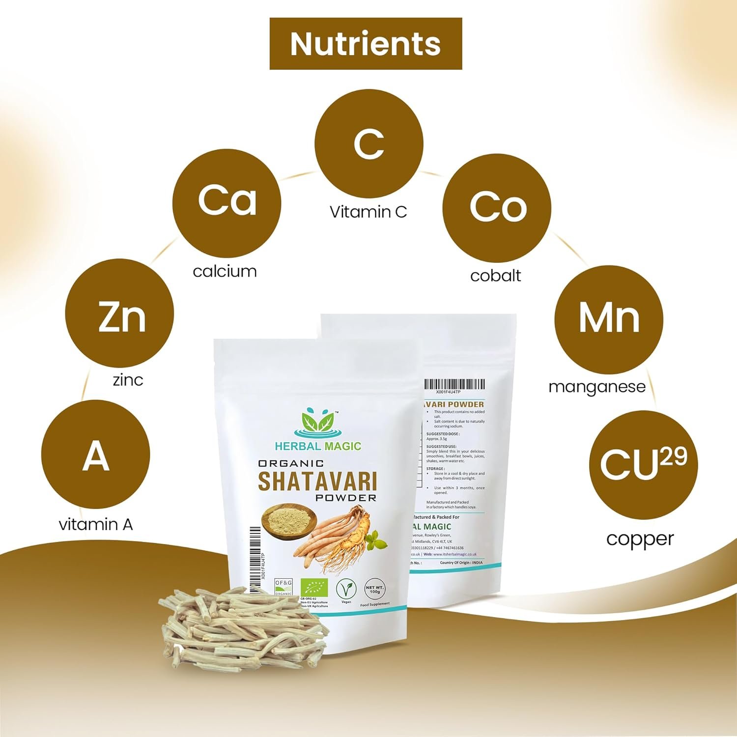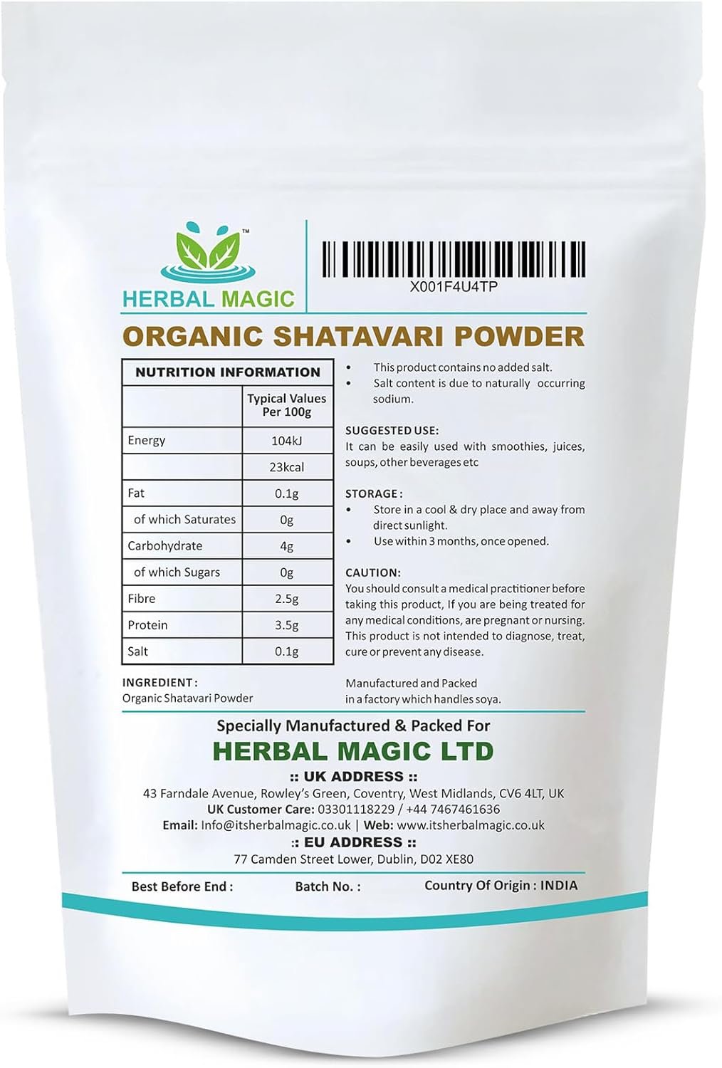 Herbal Magic’s Organic Shatavari Root Powder(Asparagus racemosus)-Prized Herb in Ayurveda-Plant of 100 Roots superfood Combi with Milk& Honey – Free from Fillers&Preservatives-300g