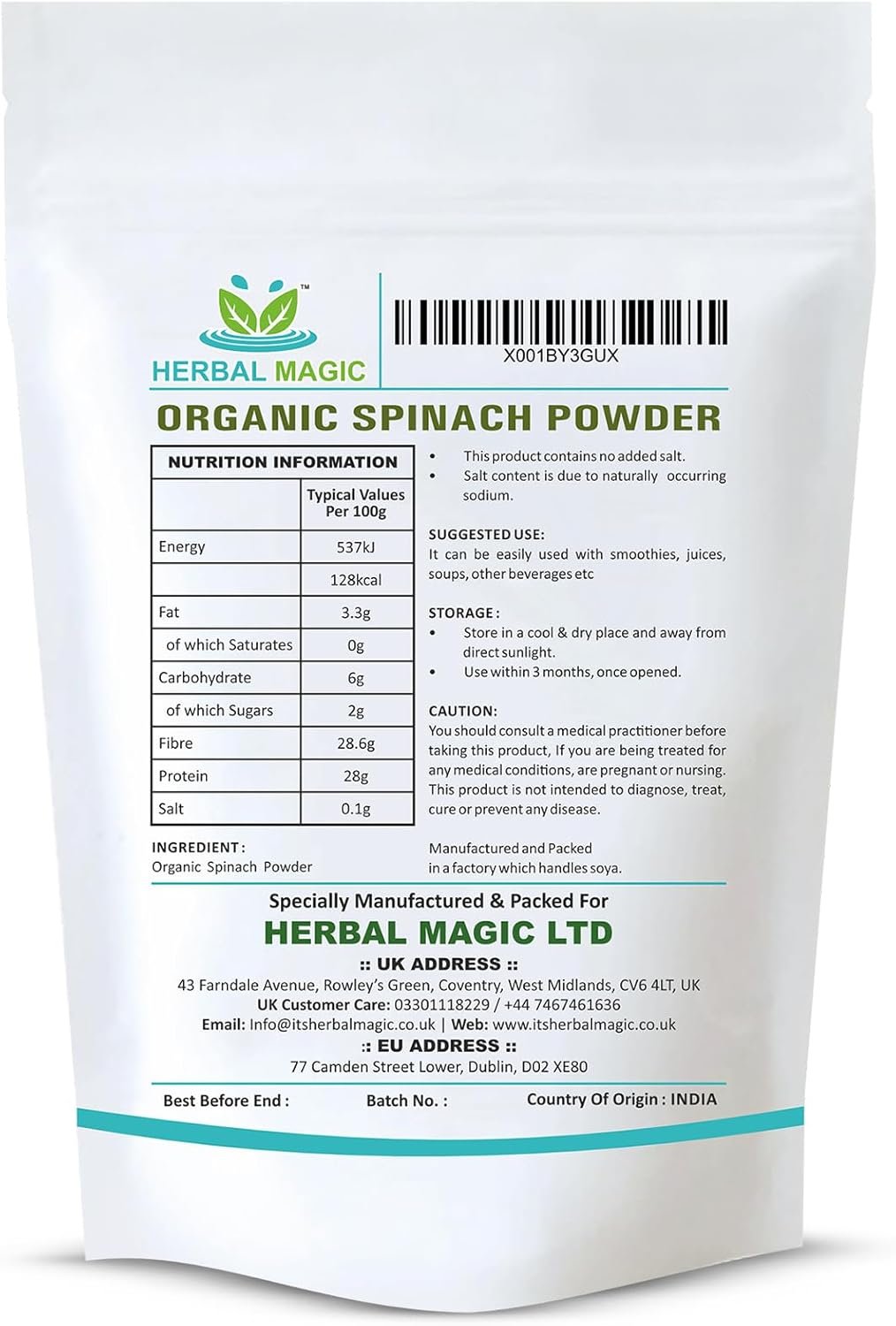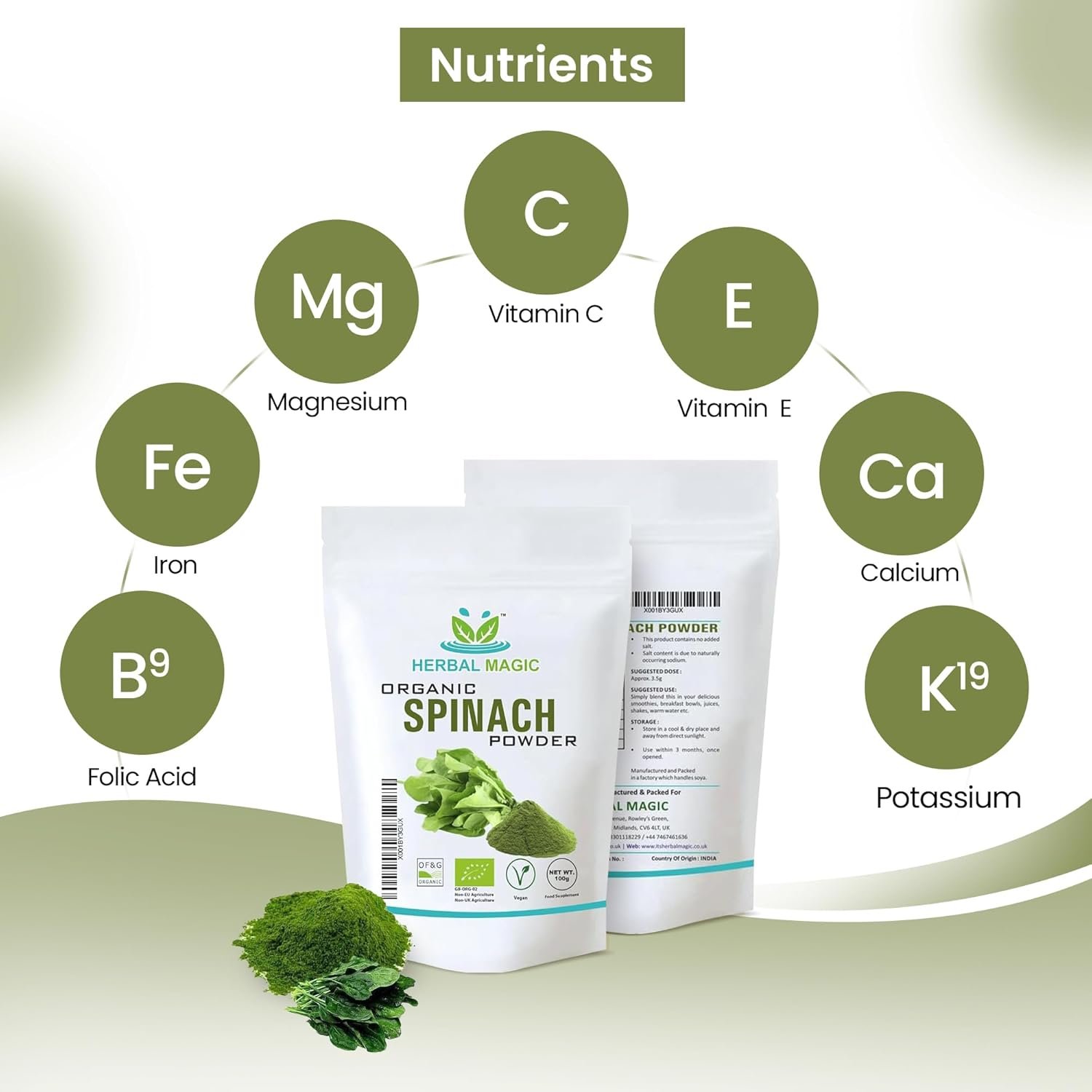 Herbal Magic’s Spinach Leaves Powder is Natural and Organic (Pure powder NOT treated/ tinctured, or cooked powder extracts) which ensures that the product retain their required color, flavor, taste, aroma, rehydration, nutritional values and extended shelf life properties without any artificial color /Preservatives/additives/No added sugar.
