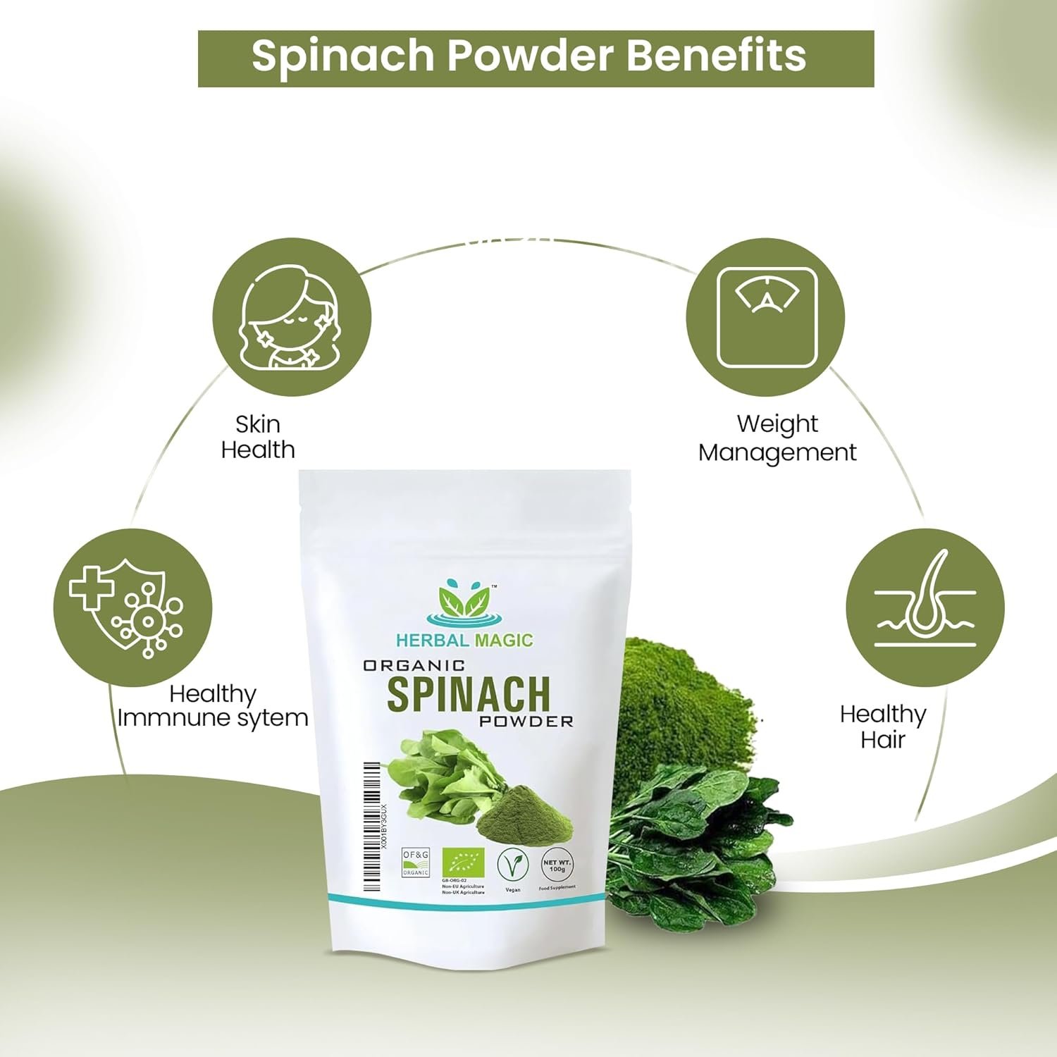Herbal Magic’s Organic Spinach Powder Green Superfood for Smoothies,Juice, Baking Free from Fillers & preservatives of&G Organic Certified (100g (Pack of 1))