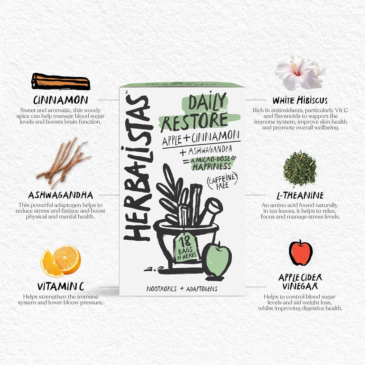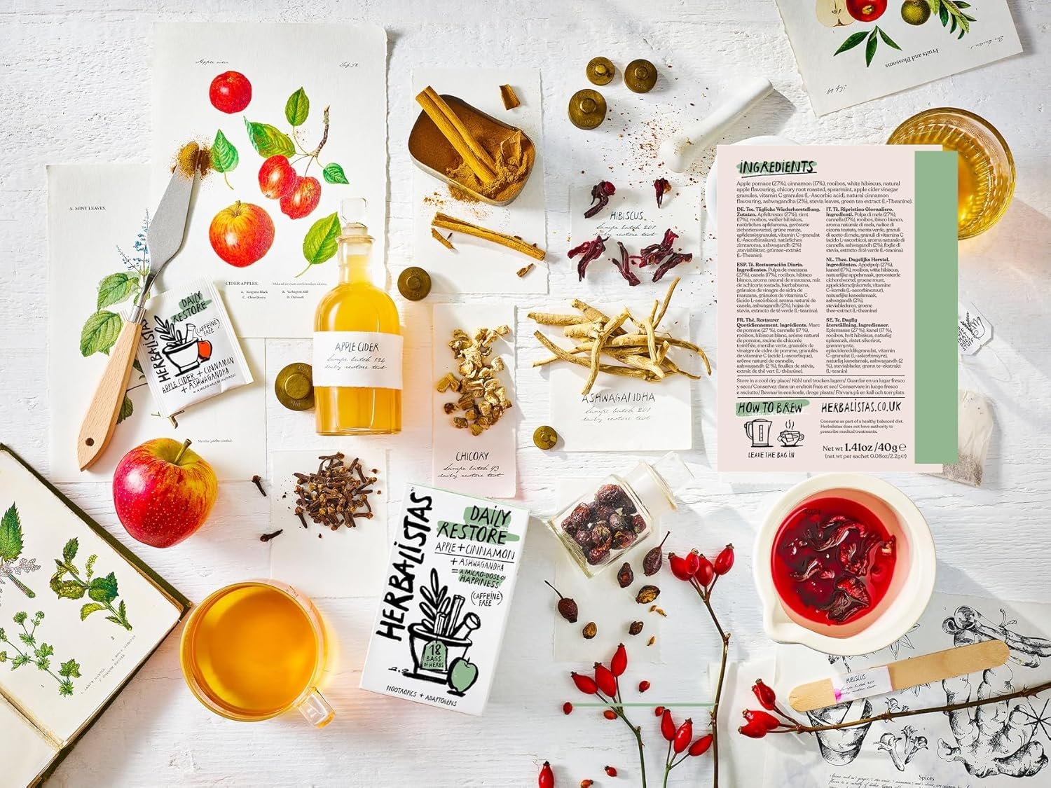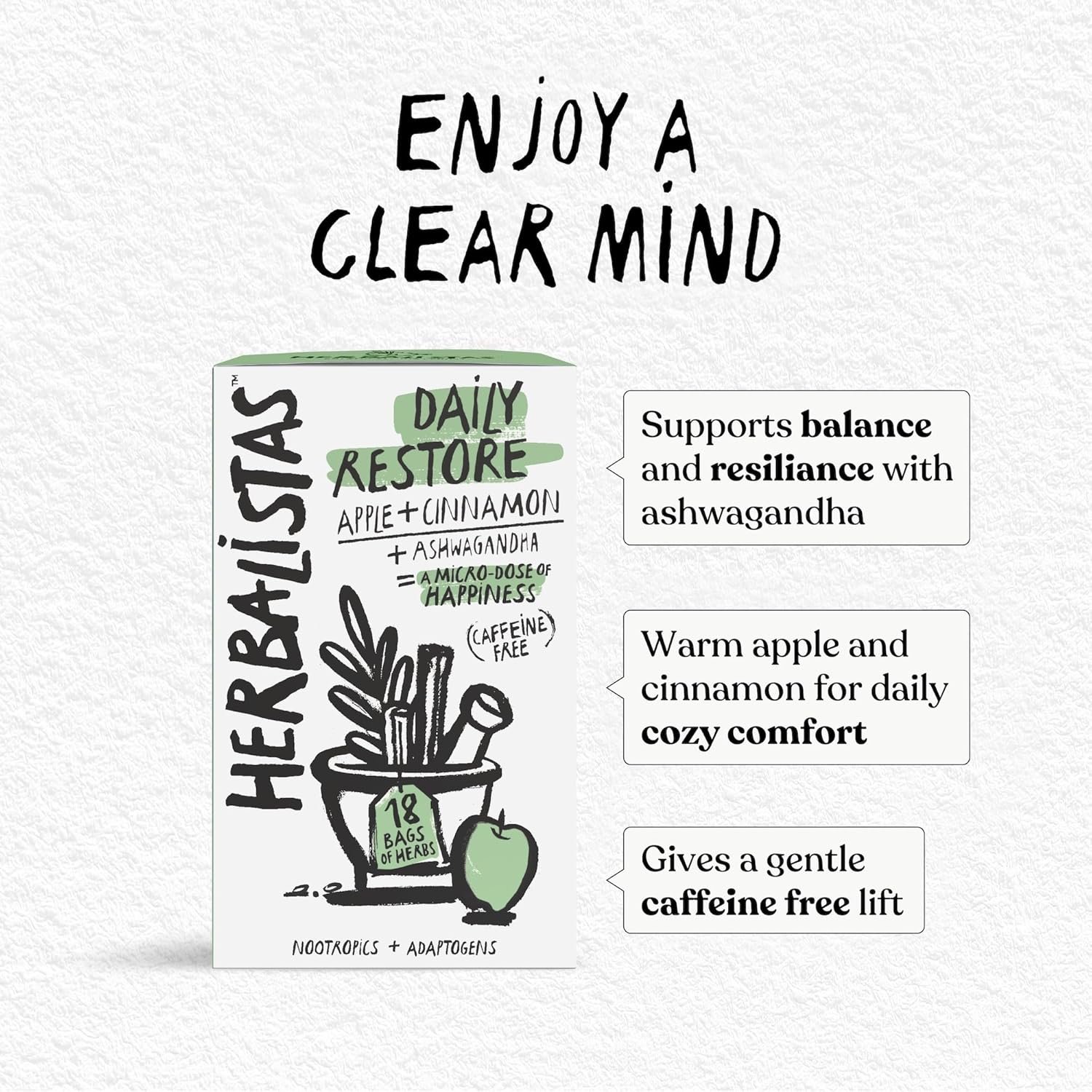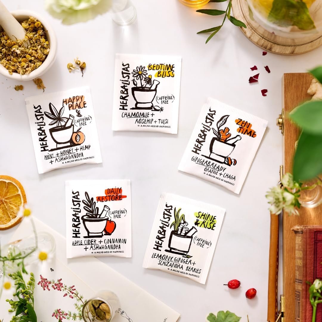 Herbalistas Daily Restore Apple Cinnamon & Ashwagandha Herbal Tea 4 x 18 Biodegradable Tea Bags | Caffeine-Free | Adaptogens, Nootropics & Botanicals for Energy, Immunity & Stress Balance | Made in UK