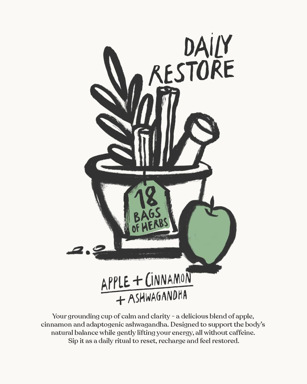 **Daily Wellness Support** – A warming infusion of apple, cinnamon, and ashwagandha designed to restore balance, fight fatigue, and support daily wellbeing.