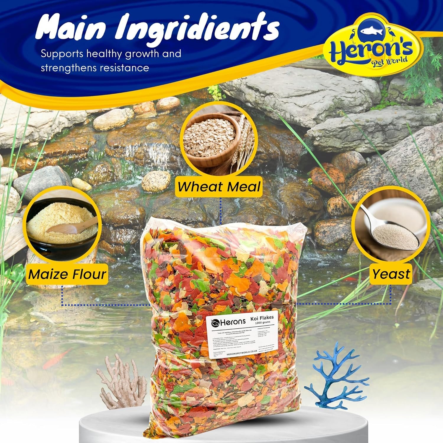 HERONS – Koi Flakes, Complete Feed for Koi, Carp and Other Pond and Coldwater Fish, With Essential Vitamins, Minerals and Trace Elements, Promotes Healthy Immune System – 500 Grams