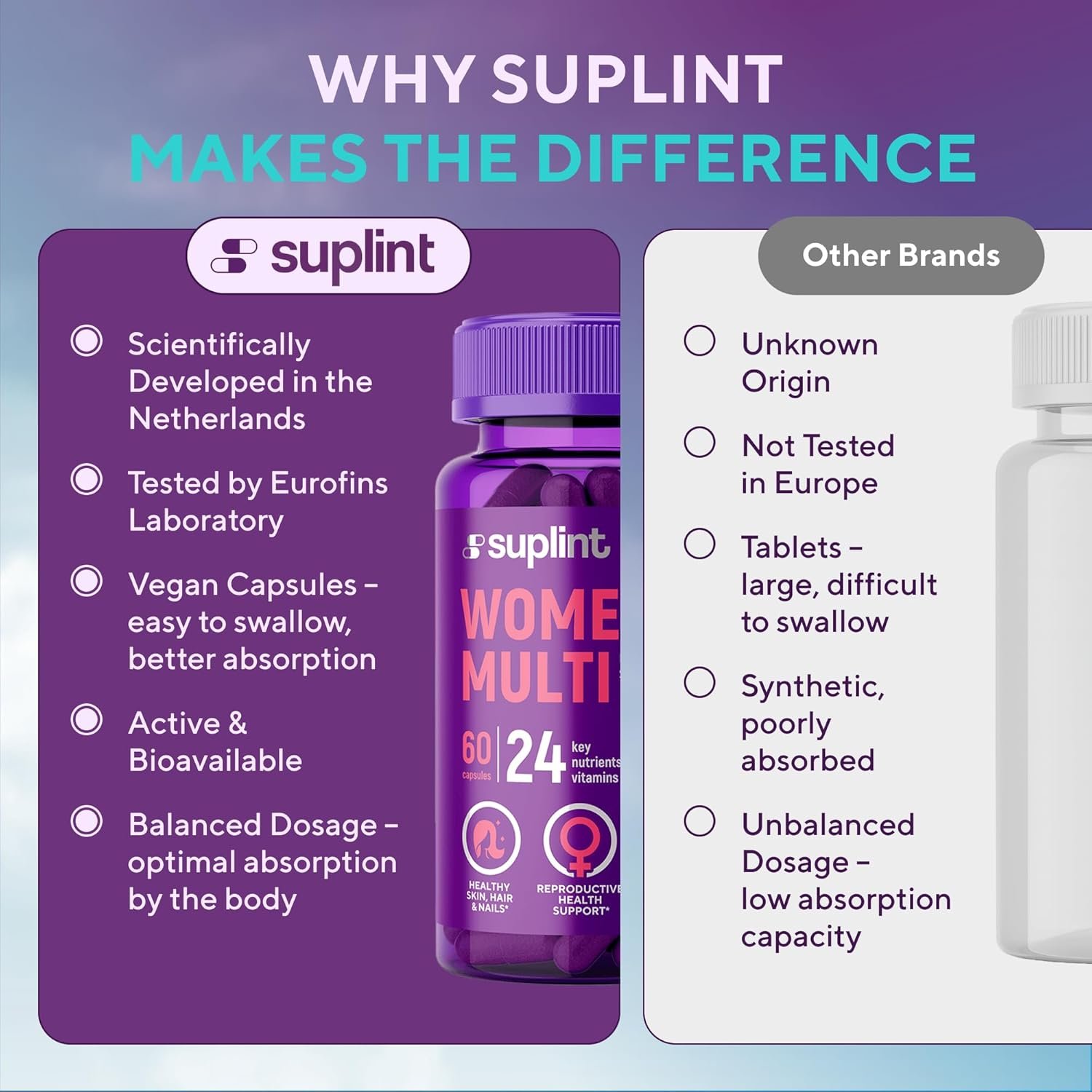 Text reads: 'WHY SUPLINT?' followed by certification icons and text: 'GMP-CERTIFIED, NON-GMO, GLUTEN-FREE, LACTOSE-FREE, SUGAR-FREE, MADE IN THE NETHERLANDS' on purple gradient background.Text reads: 'WHY SUPLINT?' followed by certification icons and text: 'GMP-CERTIFIED, NON-GMO, GLUTEN-FREE, LACTOSE-FREE, SUGAR-FREE, MADE IN THE NETHERLANDS' on purple gradient background.