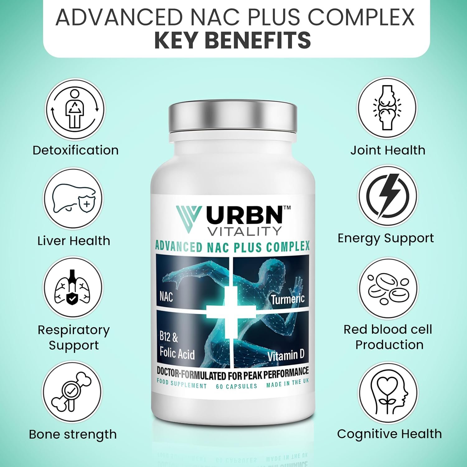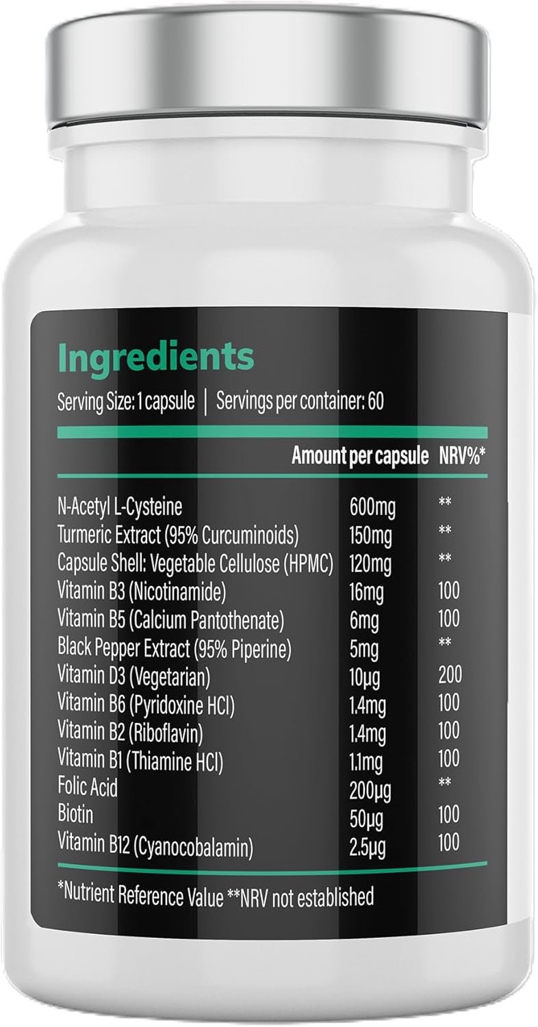 High Strength NAC Plus Complex | 5-in-1 Doctor-Formulated Supplement with N-Acetyl-Cysteine, Turmeric, Vitamin D3, B12 & Folate | Energy, Detox & Cellular Support | Made in UK