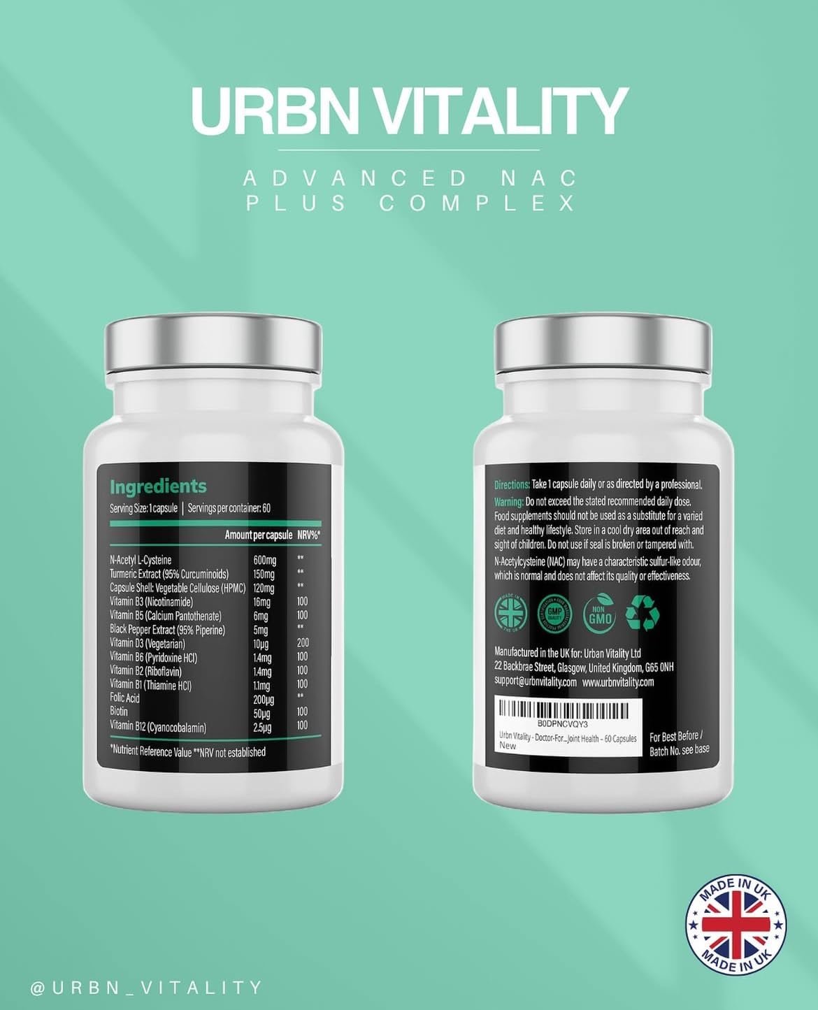 URBN VITALITY brings together five proven nutrients — N-Acetyl-Cysteine, Turmeric, Vitamin D3, B12, and Folate — each chosen for its clinical relevance and synergistic action.