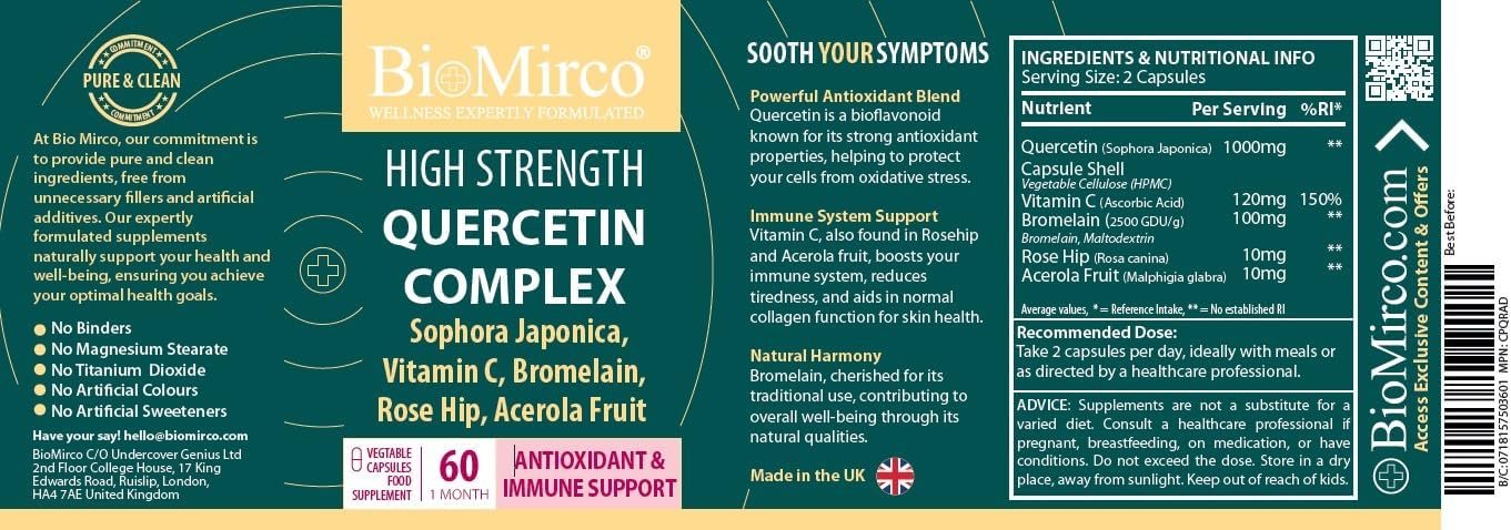 High Strength Quercetin 1000mg Complex, 60 Premium Capsules, Allergy Support, Powerful Antioxidant Supplements, Anti-inflammatory Antioxidant Supplement, Alternative to quercetin Powder, UK Made