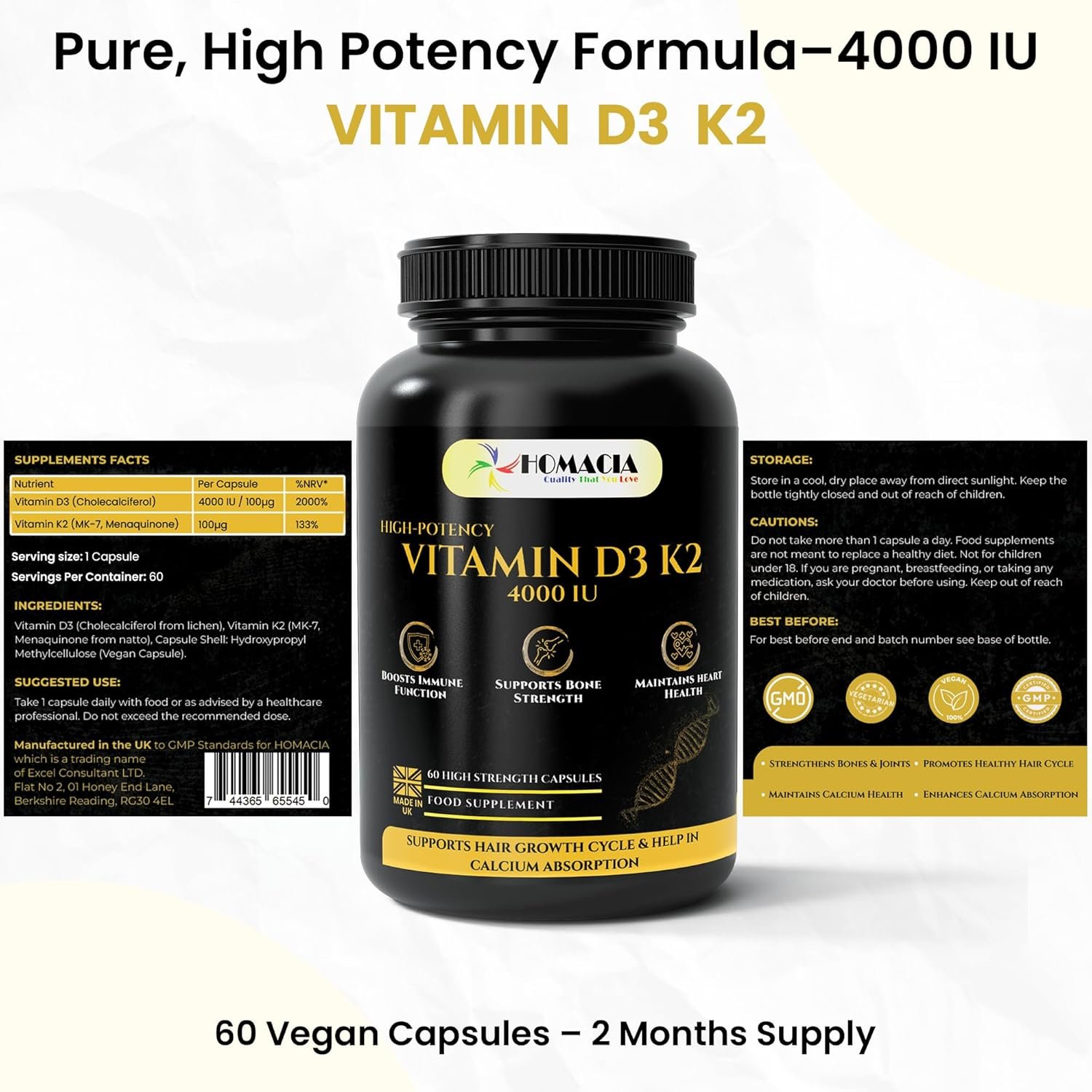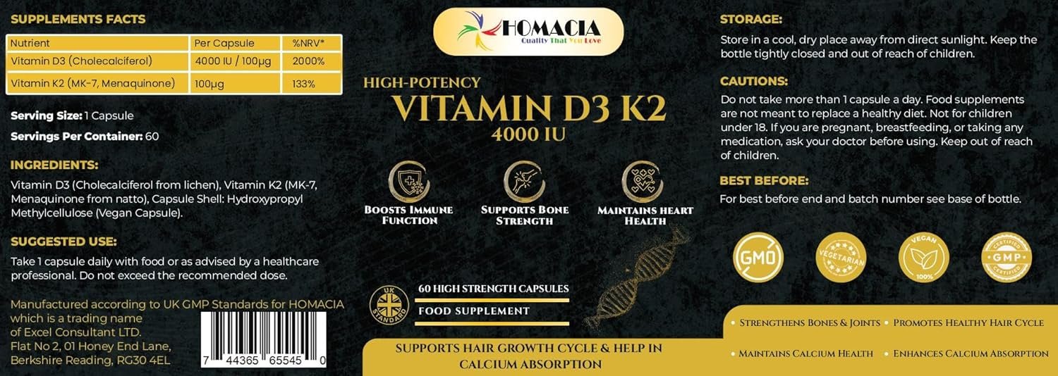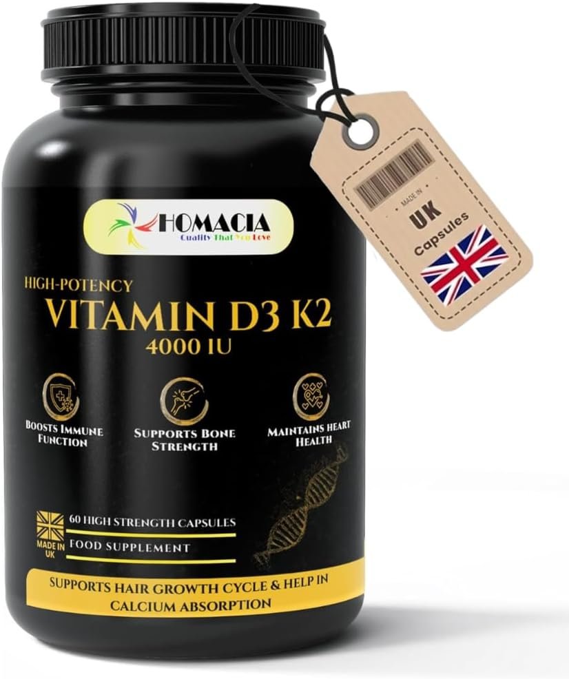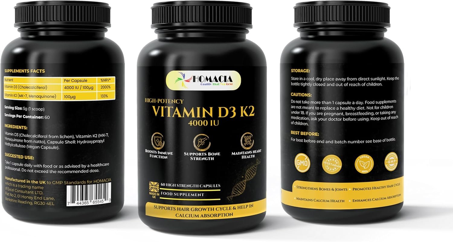 Homacia Vitamin d3 K2 – 4000 IU – 60 Vegan Capsules – Bone, Heart & Immune Support – High Strength d3 and k2 Vitamin | D3 + MK-7 K2 | Vitamin k2– Made in UK