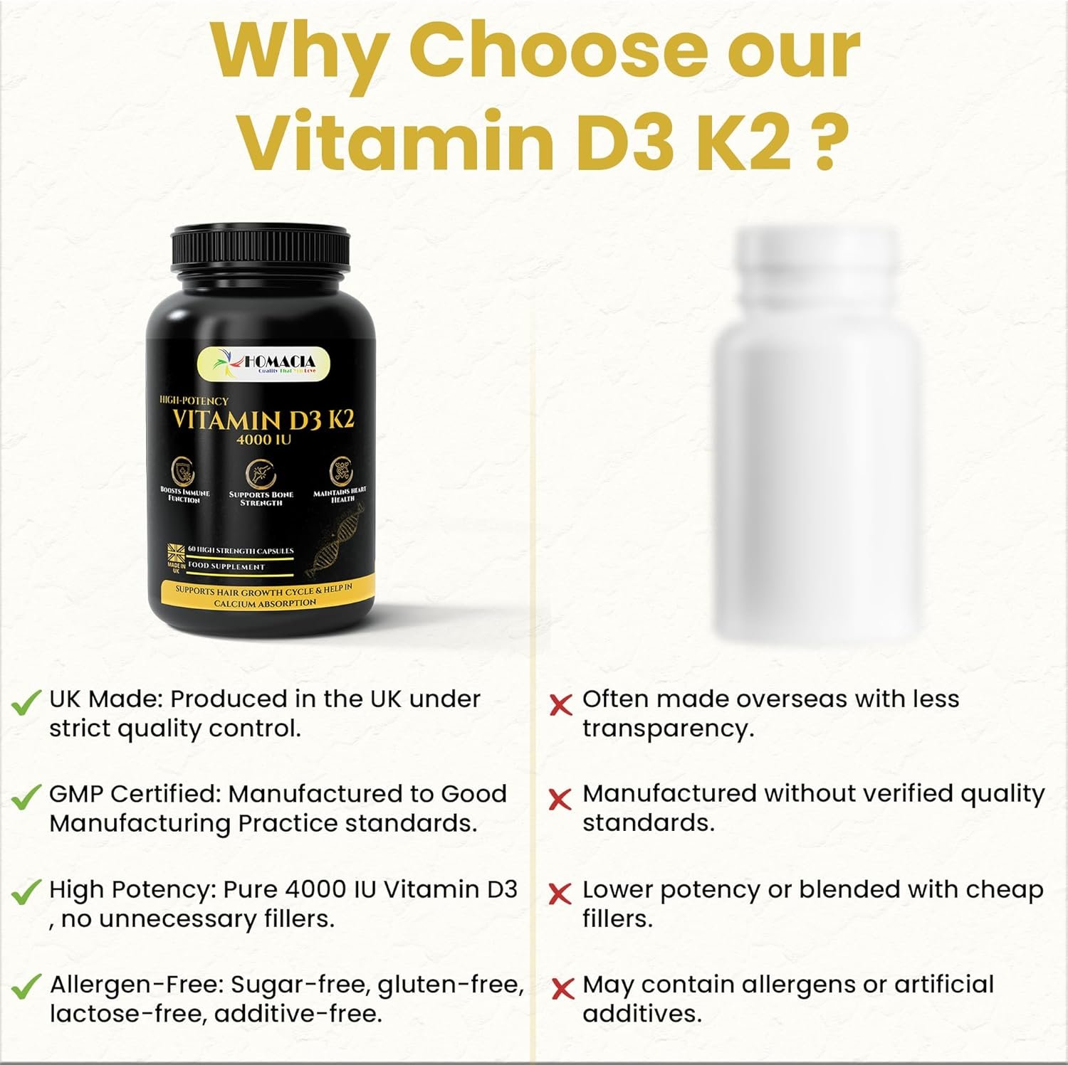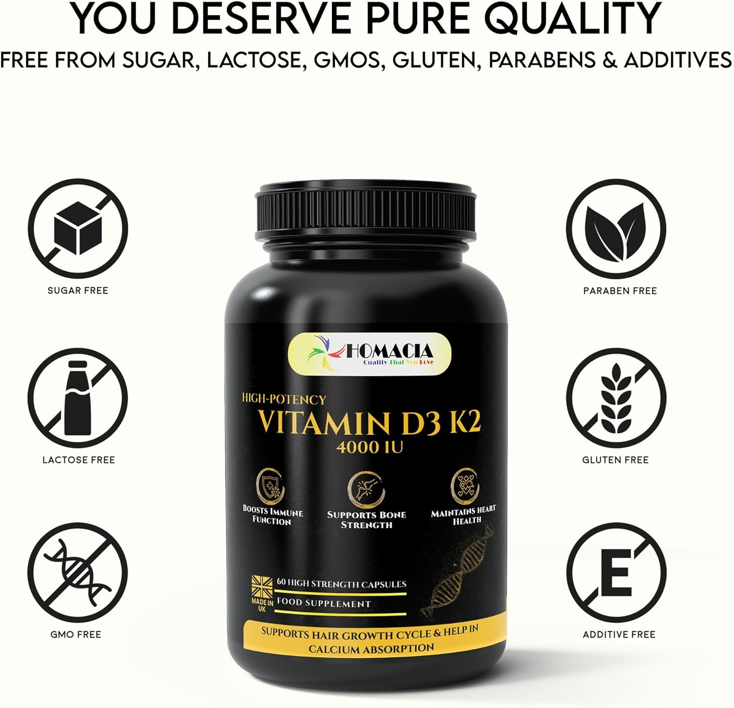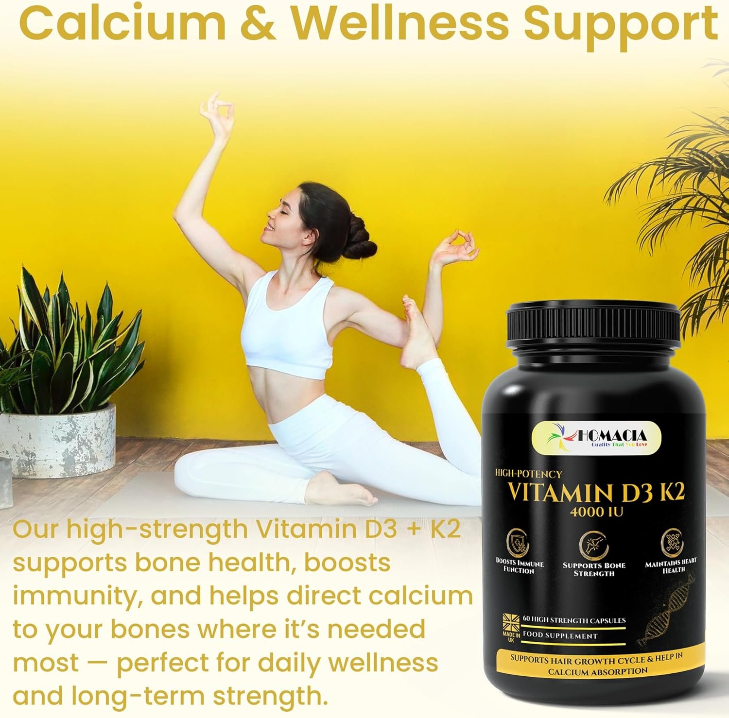 Homacia Vitamin d3 K2 – 4000 IU – 60 Vegan Capsules – Bone, Heart & Immune Support – High Strength d3 and k2 Vitamin | D3 + MK-7 K2 | Vitamin k2– Made in UK