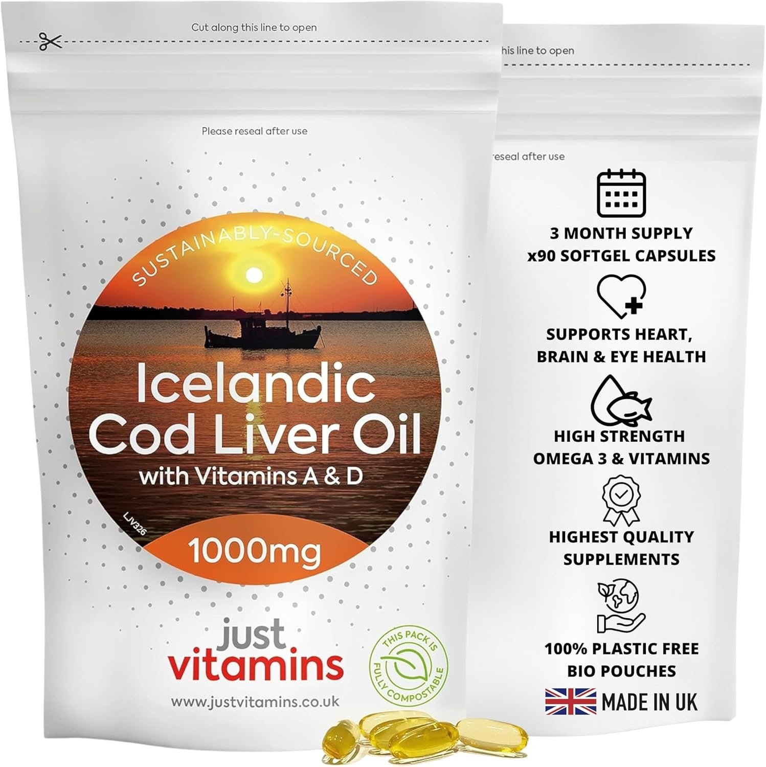 100% PLASTIC FREE: Our 1000mg High strength Icelandic Cod Liver Oil Capsules come in a resealable, biodegradable pouch that keeps tablets fresh and reduces plastic waste, supporting both your health and the planet.