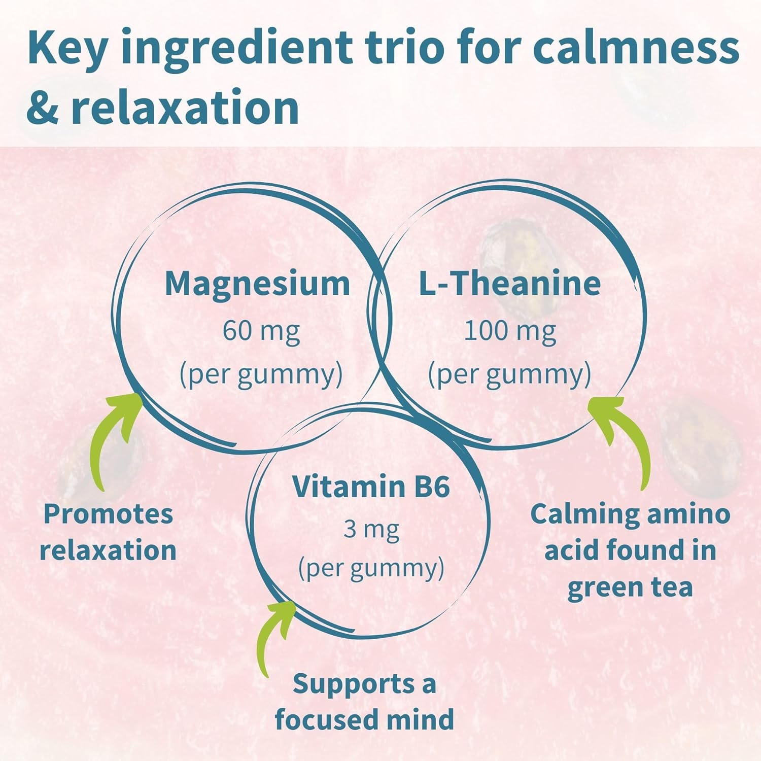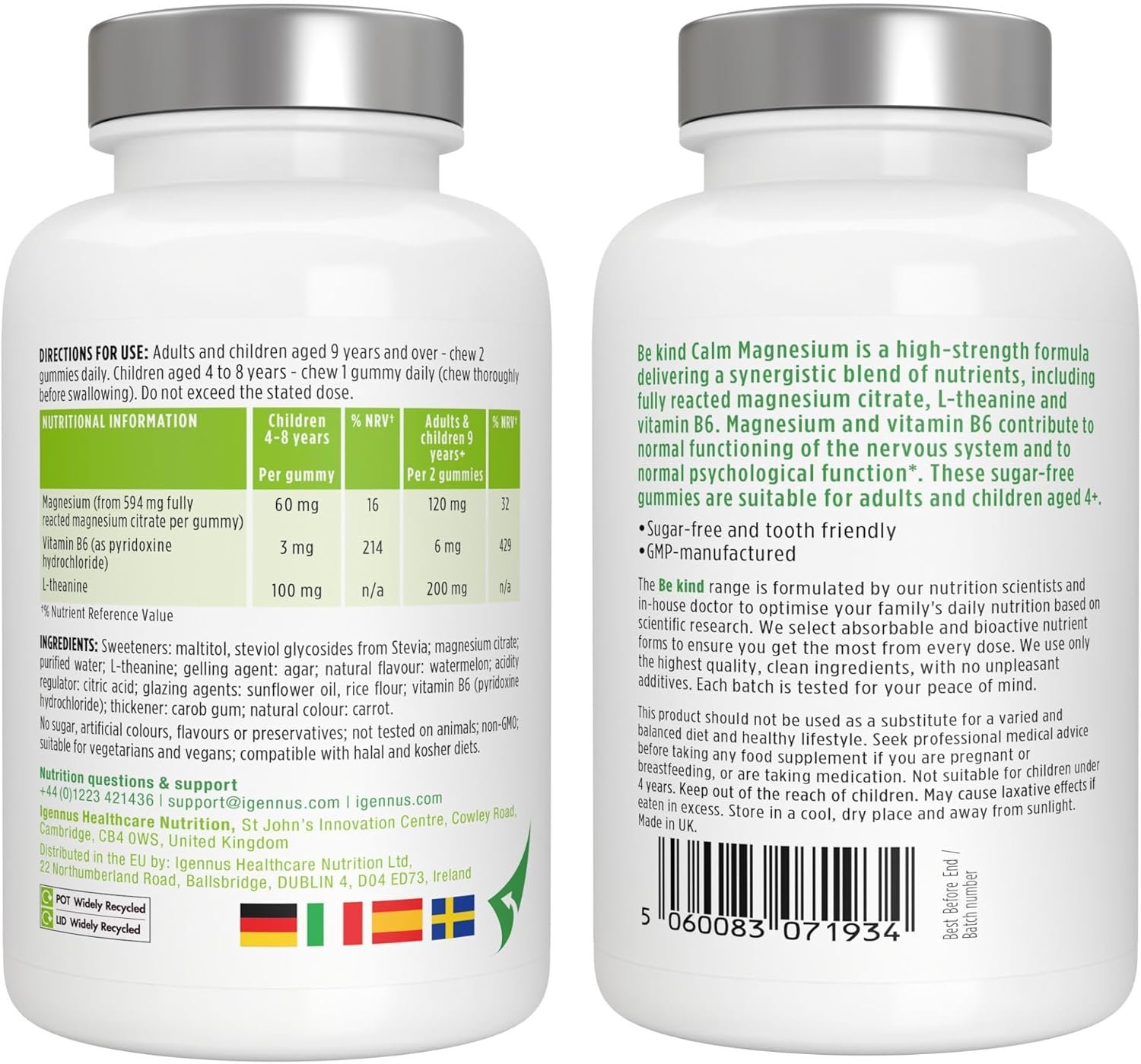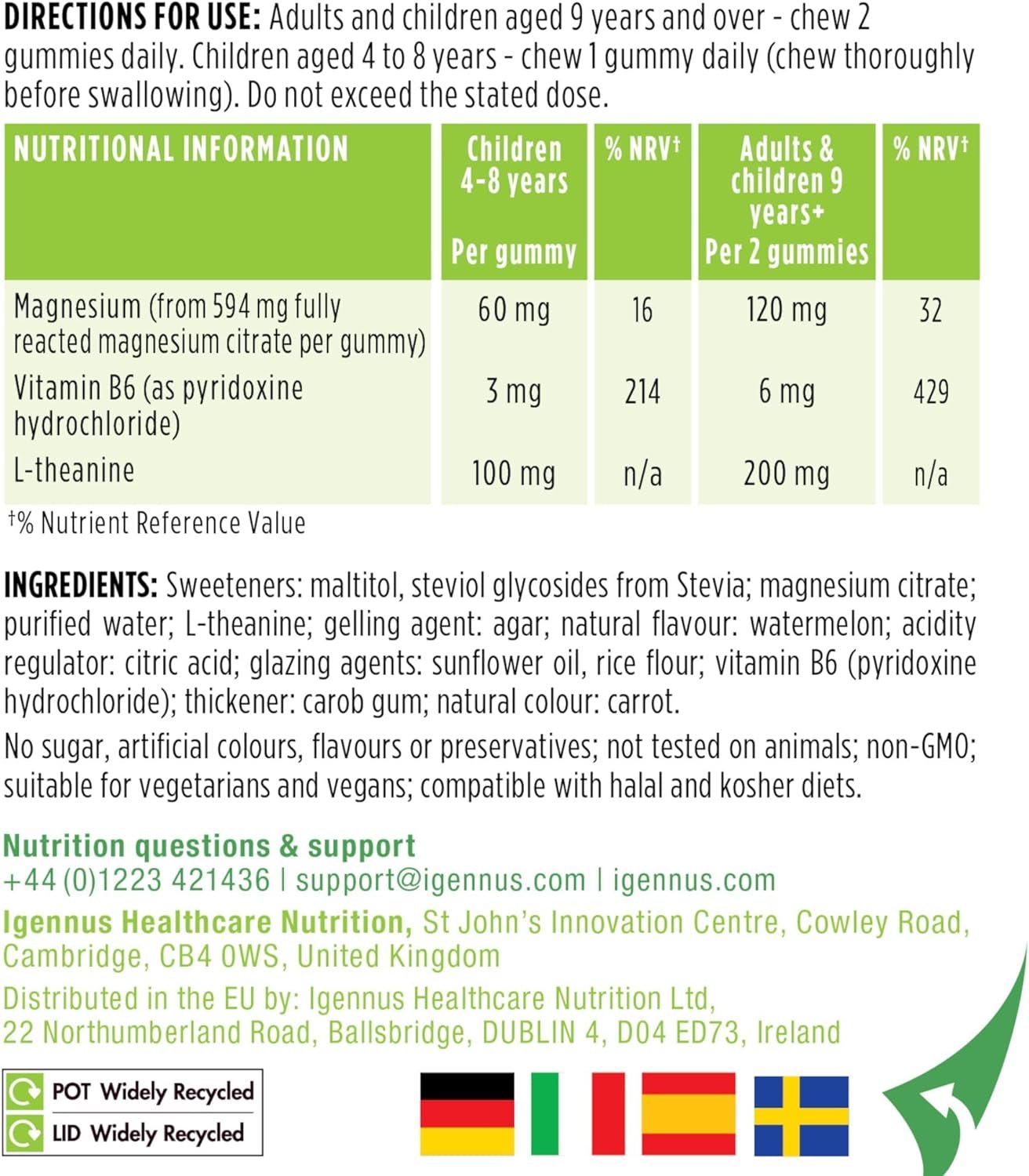 Igennus Calm Magnesium Gummies, L-Theanine & Vitamin B6, for Kids & Adults, 90 Sugar-Free Gummies, Watermelon Flavour, Clean Ingredients & Vegan, 45-90 Servings