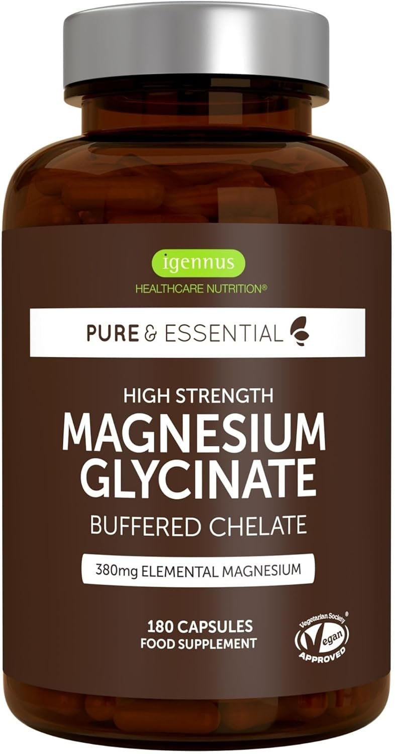 Igennus Highest Strength Chelated Magnesium Glycinate 1300mg, 380mg Elemental, 90 Servings, Pure & Clean Buffered Magnesium Bisglycinate, Vegan, 180 Capsules