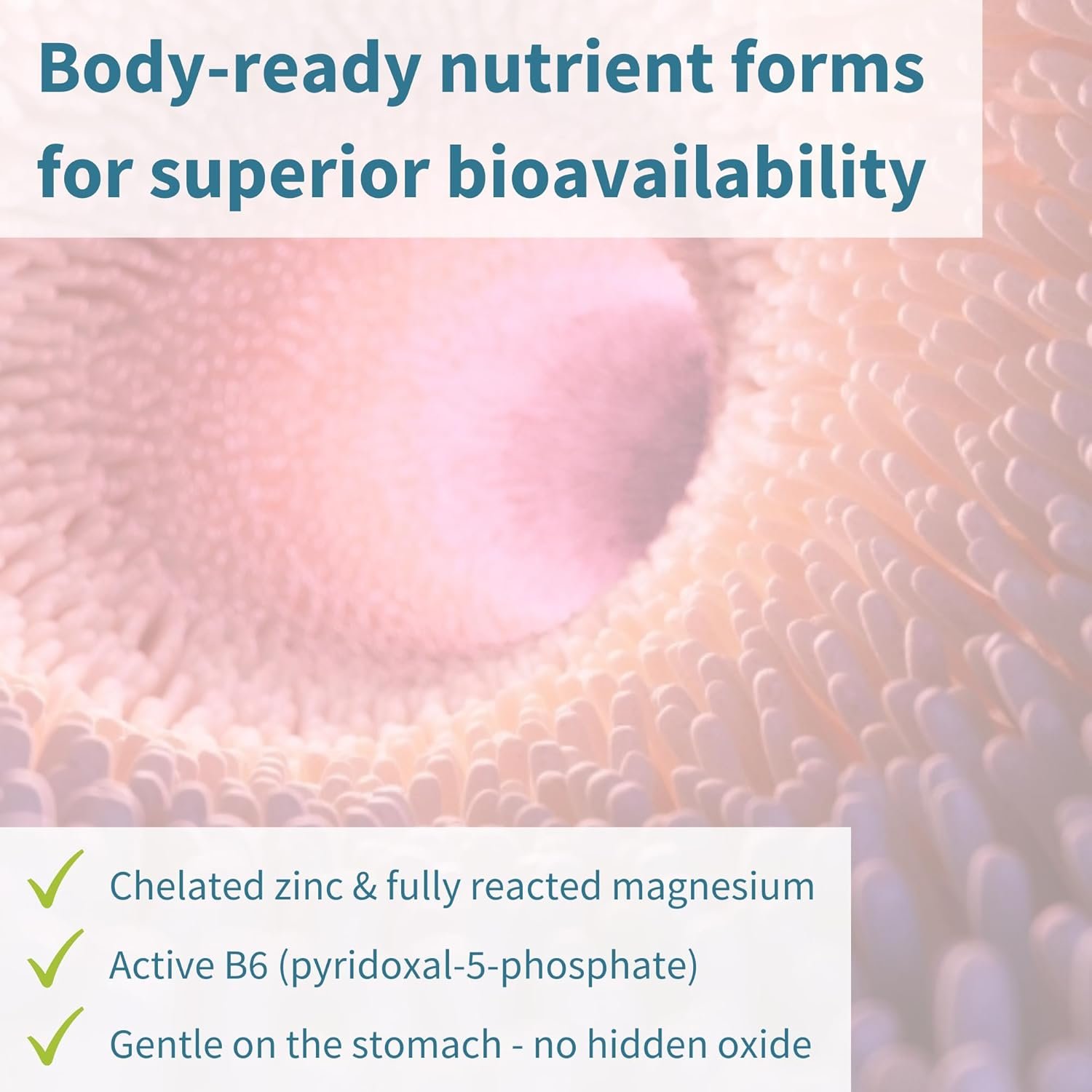 BIOAVAILABLE FORMS – chelated zinc picolinate, magnesium citrate & vitamin B6 (as pyridoxal-5-phosphate) have been selected by our nutrition scientists for enhanced bioavailability; free from magnesium oxide