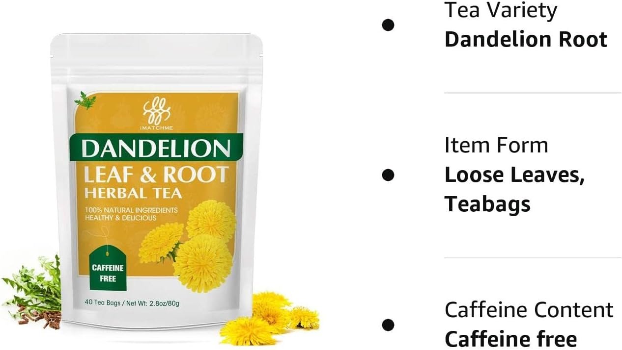 iMATCHME Organic Dandelion Tea, Dandelion Leaf & Root Tea, Herbal Tea, Digestion and Immune Support, Caffeine Free, 40 Bags/80g