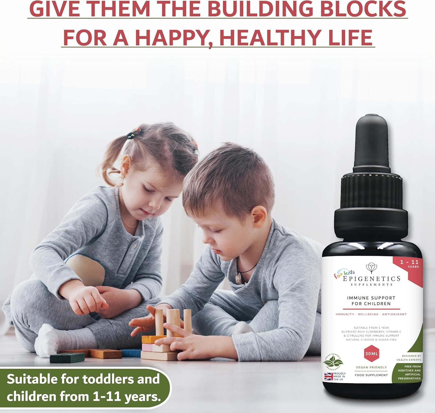 At Epigenetics, we believe that children deserve the highest-quality, research-backed supplements to support their health and development. Our Immune Support for Children is designed specifically for kids aged 1-11 years, providing a carefully balanced blend of Vitamin C and Elderberry in a gentle, sugar-free liquid. Developed by leading healthcare practitioners, this formula is based on extensive clinical research, ensuring your child gets the best support in a form that’s easy to take. With 20 drops a day, this highly concentrated liquid makes it simple to incorporate essential nutrients into your child’s daily routine—no large tablets or difficult dosing. Vitamin C contributes to the normal function of the immune system, helping to support overall well-being throughout the year. It also plays a vital role in collagen formation, which is essential for healthy bones, cartilage, gums, skin, and teeth as children grow. We are committed to pure, high-quality ingredients, which is why our Immune Support for Children contains no artificial colours, flavours, preservatives, or fillers—just a clean and natural formula with essential nutrients. To maintain the freshness and potency of our liquid formula, we use premium Miron Violetglass bottles, which naturally protect against harmful sunlight and preserve the quality of the contents without the need for artificial preservatives. This reusable bottle can also be used to store other liquids around the house or while travelling. Proudly manufactured in the UK in our GMP-certified facility, this supplement is 100% sugar-free and vegan-friendly, making it an ideal choice for plant-based families looking for a trusted, high-quality supplement to support their child’s daily nutrition. Choose Epigenetics Immune Support for Children—a gentle, effective, and research-backed supplement designed for the growing needs of little ones.
