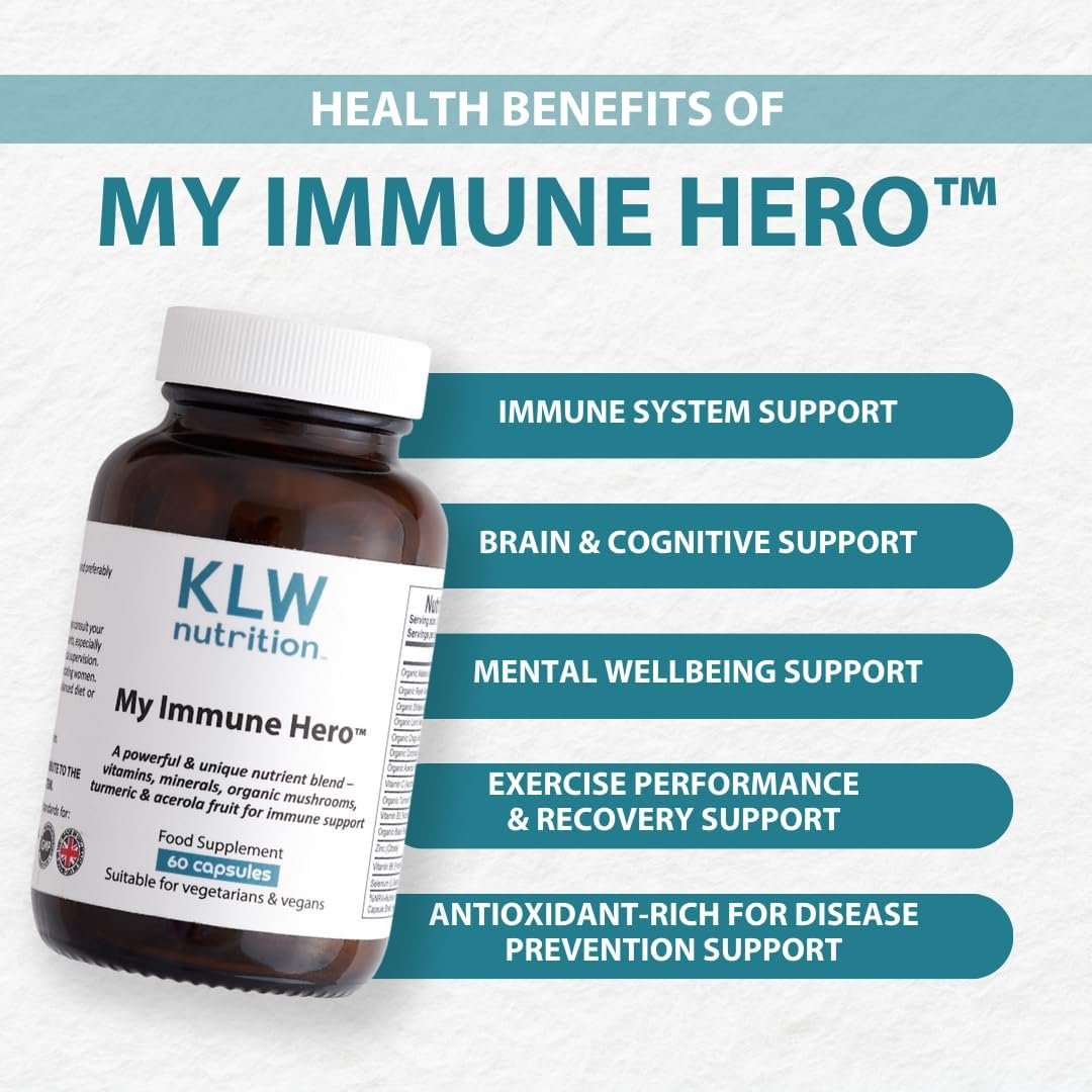 My Immune Hero contains a unique combination of active ingredients, with six organic mushrooms, plant extracts, vitamins and minerals meant to take your body’s immune defence capacity to the next level. Rich in anti-oxidants, with no artificial sweeteners, preservatives or harmful fillers, which have been shown to damage gut health and lead to gut inflammation. My Immune Hero has enhanced bioavailability ensuring a rapid nutrient absorption – this immune system support supplement is an excellent choice for men and women of all ages, promoting a strong and balanced immune system as well as brain and cognitive support.