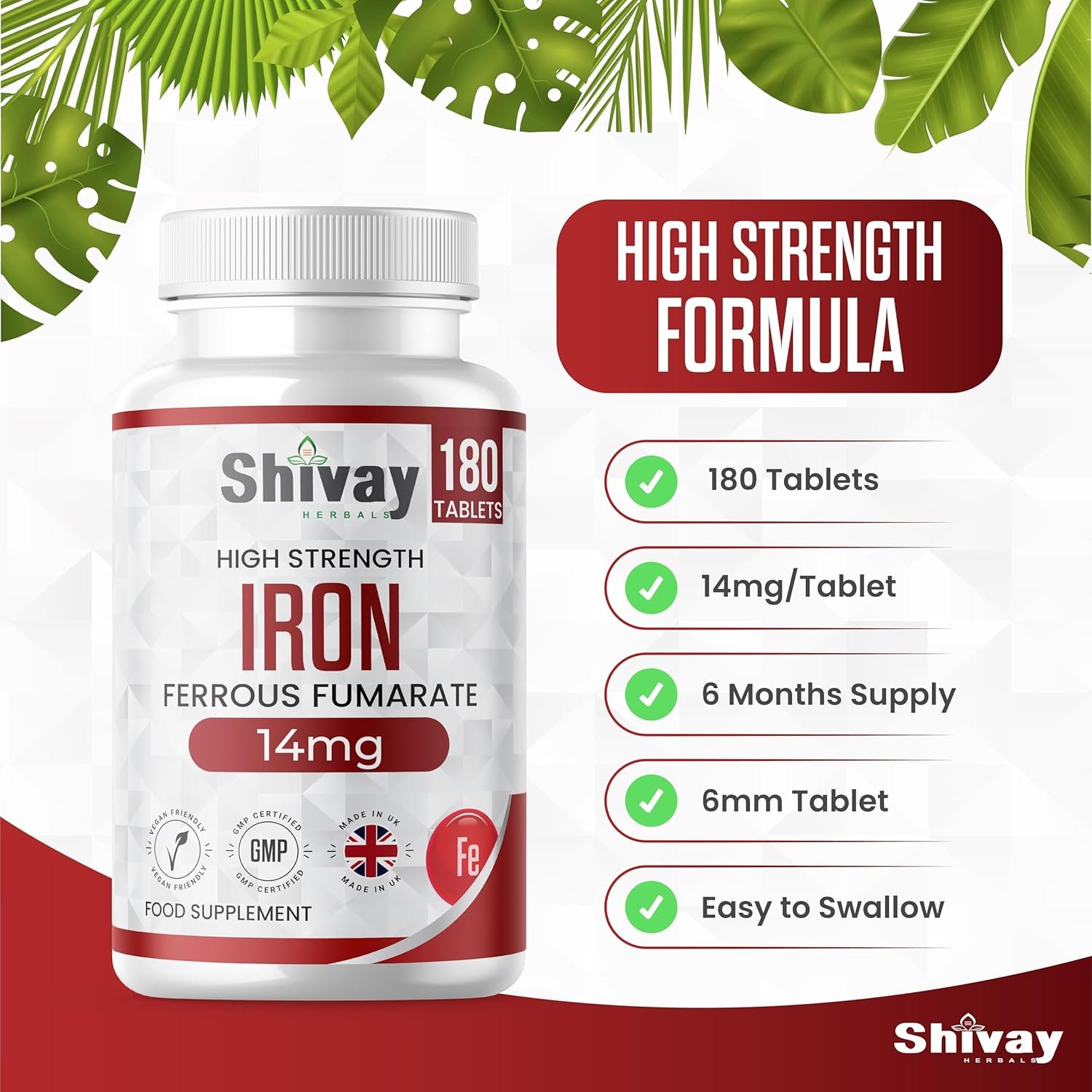 Iron 14mg Tablets | 180 Vegan Tablets – 6 Month Supply | High Strength Ferrous Fumarate Supplement | for Tiredness & Fatigue | Made in The UK by Shivay Herbals
