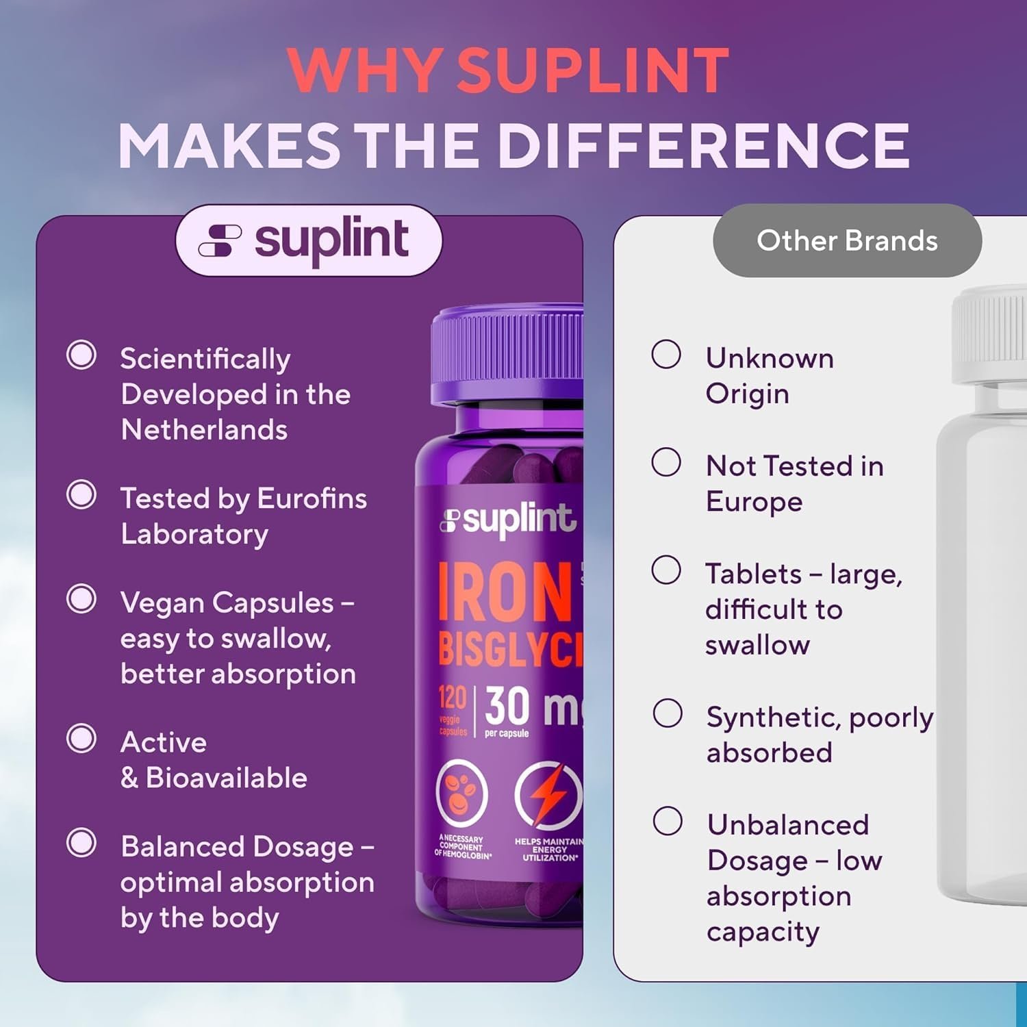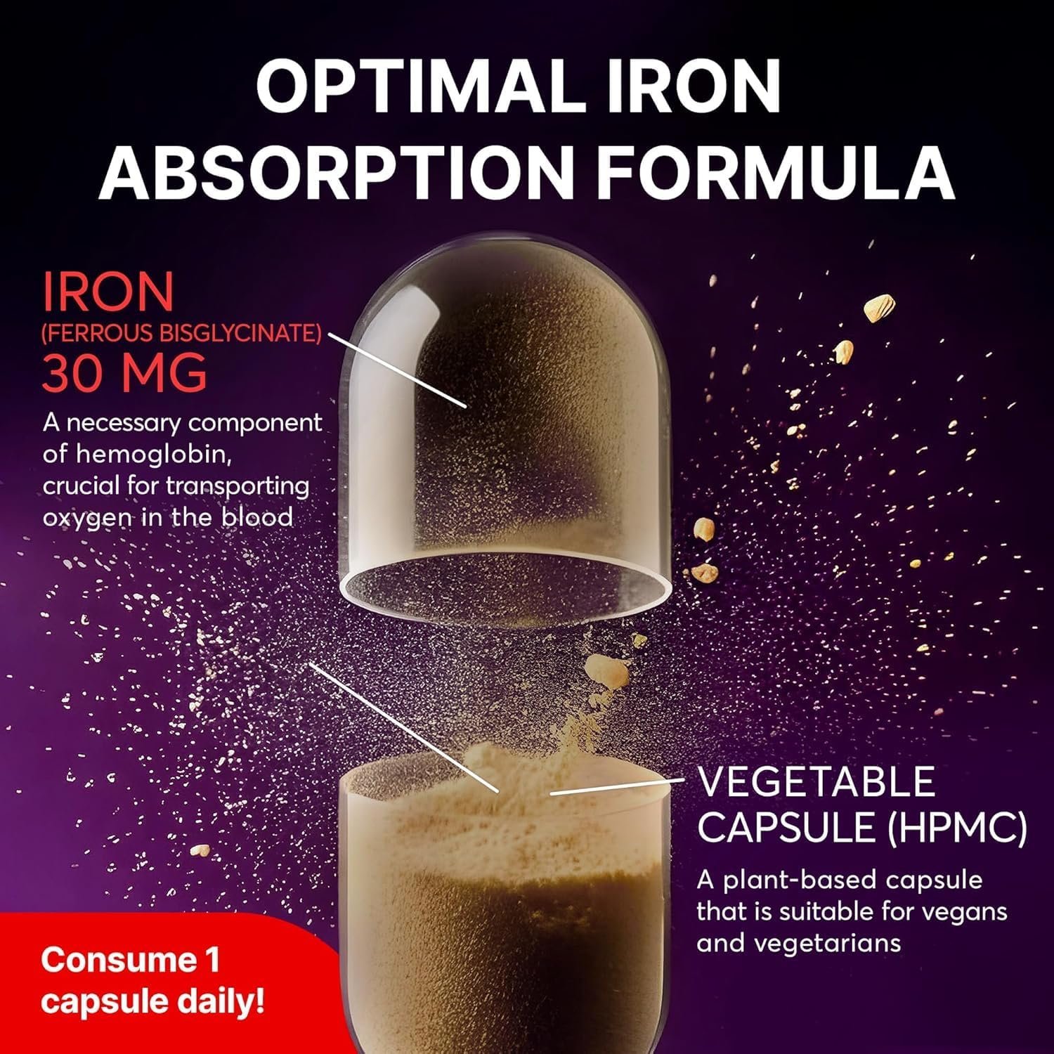 Easy-to-Swallow Capsules – Superior Absorption – Unlike hard-to-digest tablets, our vegan capsules with 30 mg iron bisglycinate offer gentle, effective absorption – ideal for daily comfort and maximum uptake.