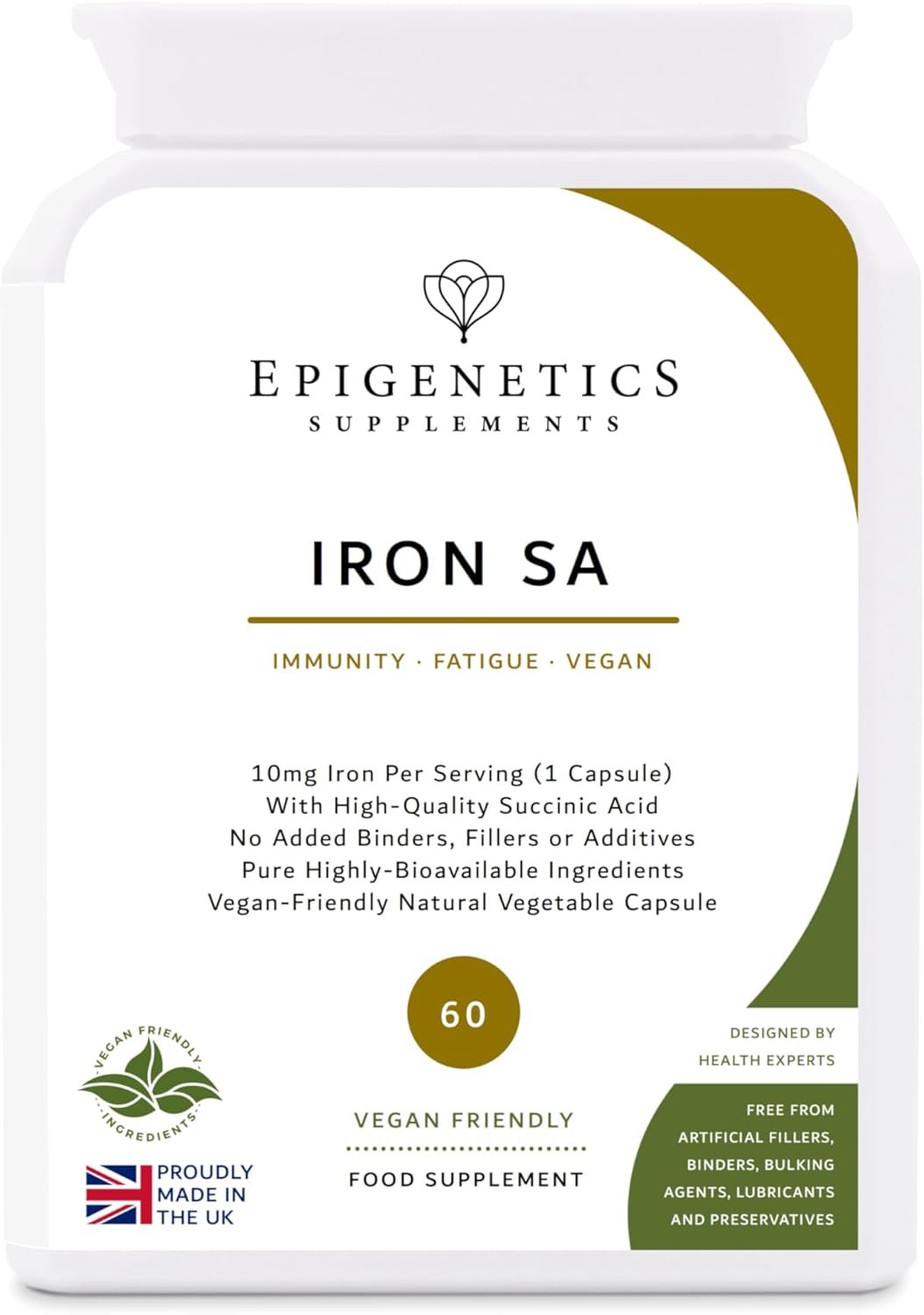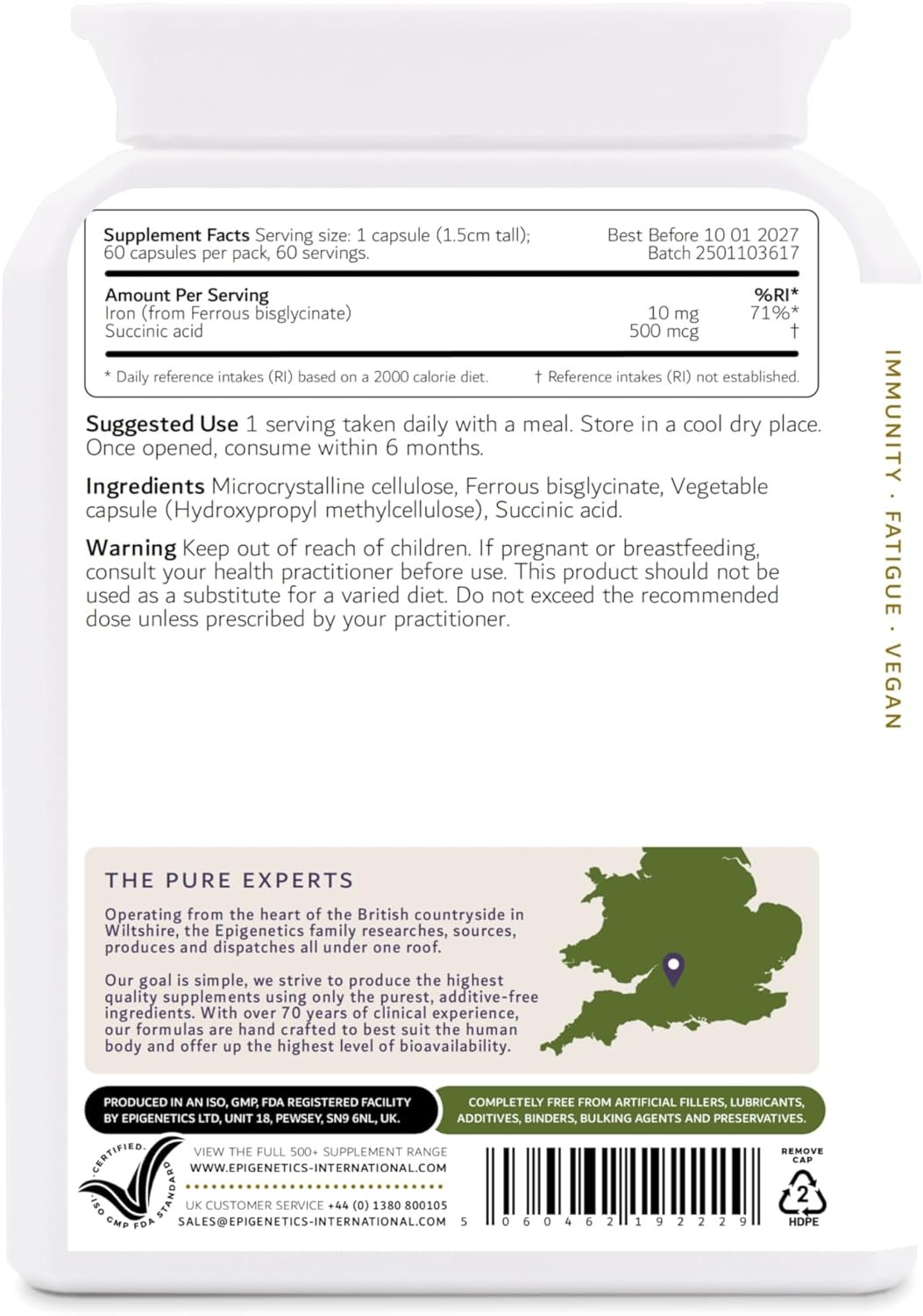 Iron SA | 10mg Iron (Ferrous Bisglycinate) + Natural Succinic Acid Antioxidant | 60 Vegan Friendly Capsules UK Made | Long 2 Month Supply by Epigenetics Supplements
